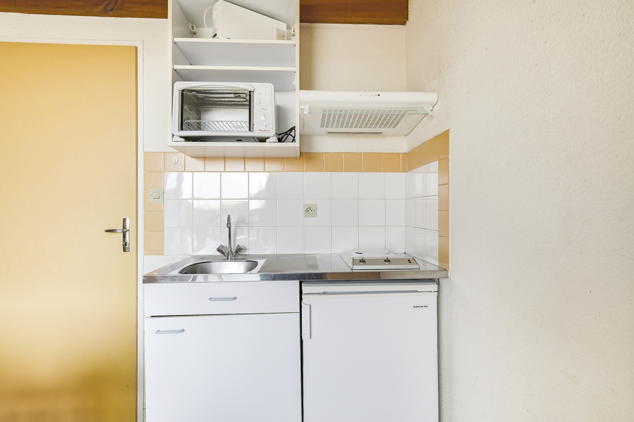 Eingerichtete Kochecke mit Elektroplatten, Dunstabzug, Mikrowelle, Kaffeemaschine, Wasserkochern Kühlschrank