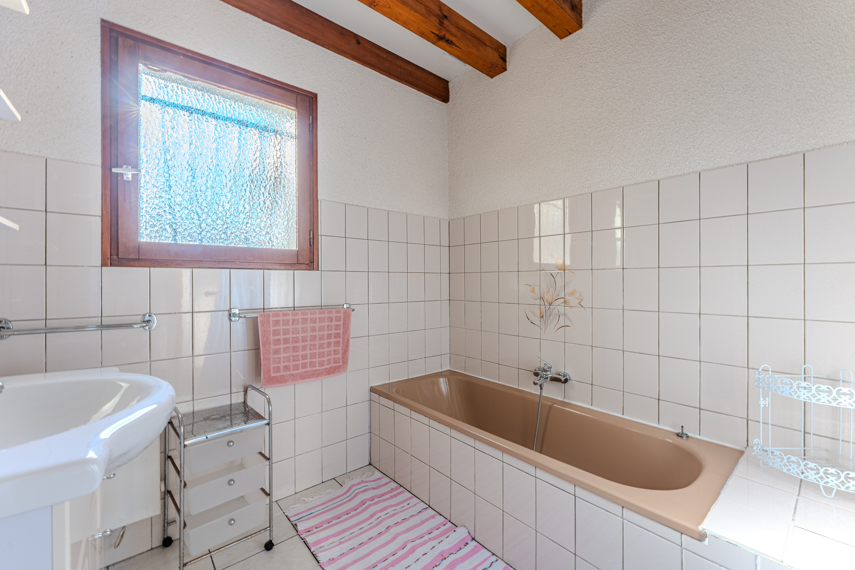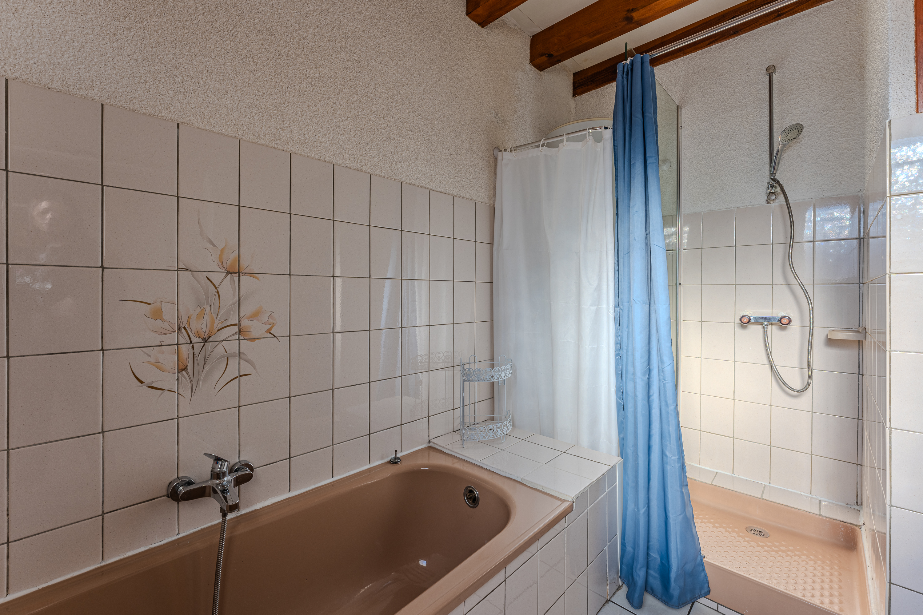 Ein Zimmer mit Doppelbett und integrierte Schrank. Badezimmer mit Dusche und Badewanne. Separate WC.