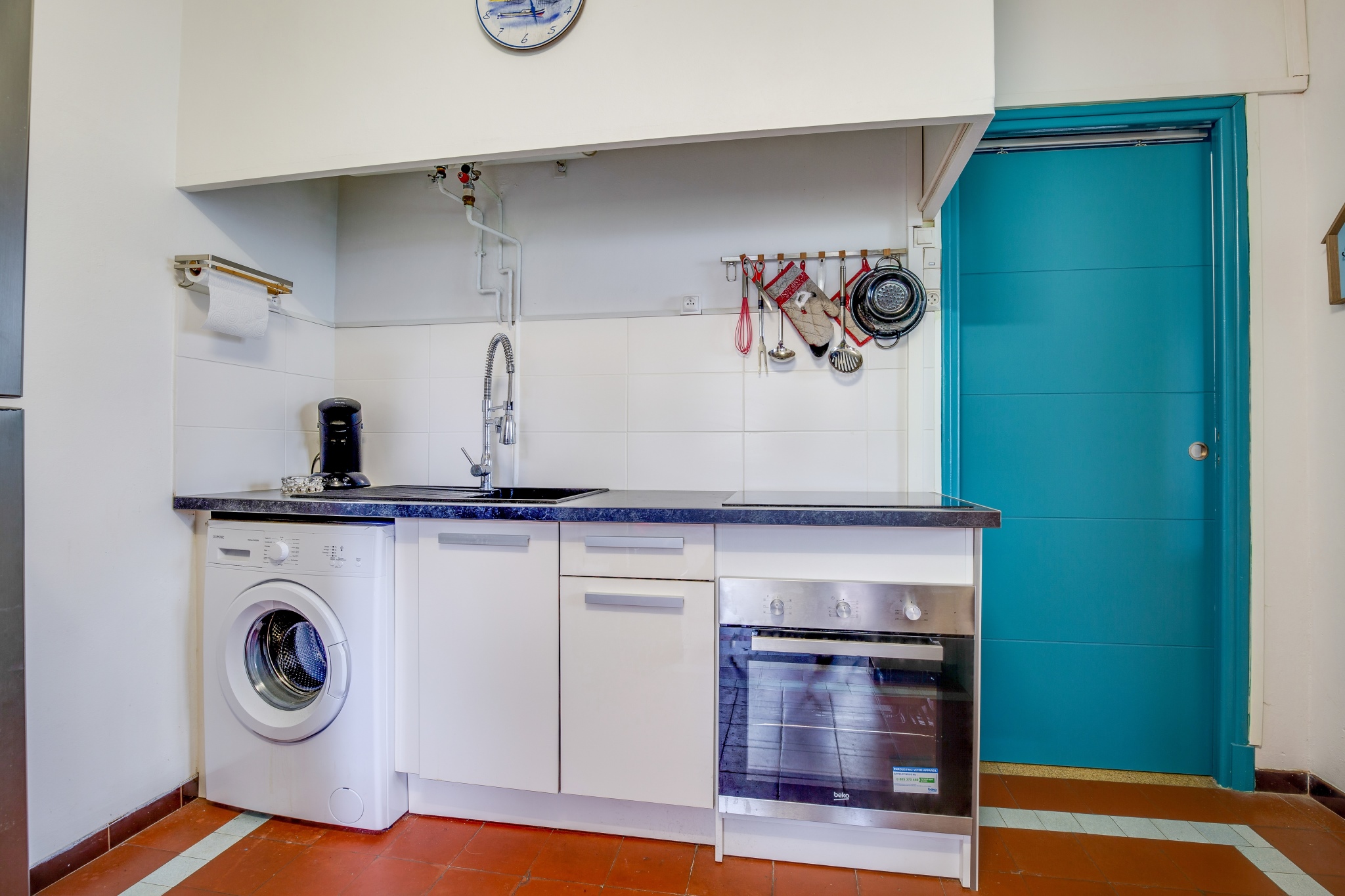 Offene Küche mit Herdplatten (Gaz), Ofen, Kühlschrank, Mikrowellen.