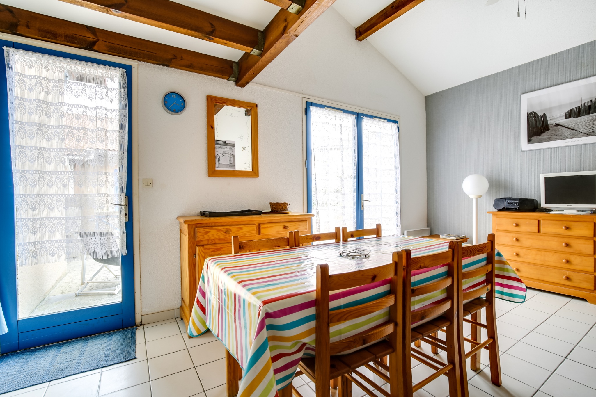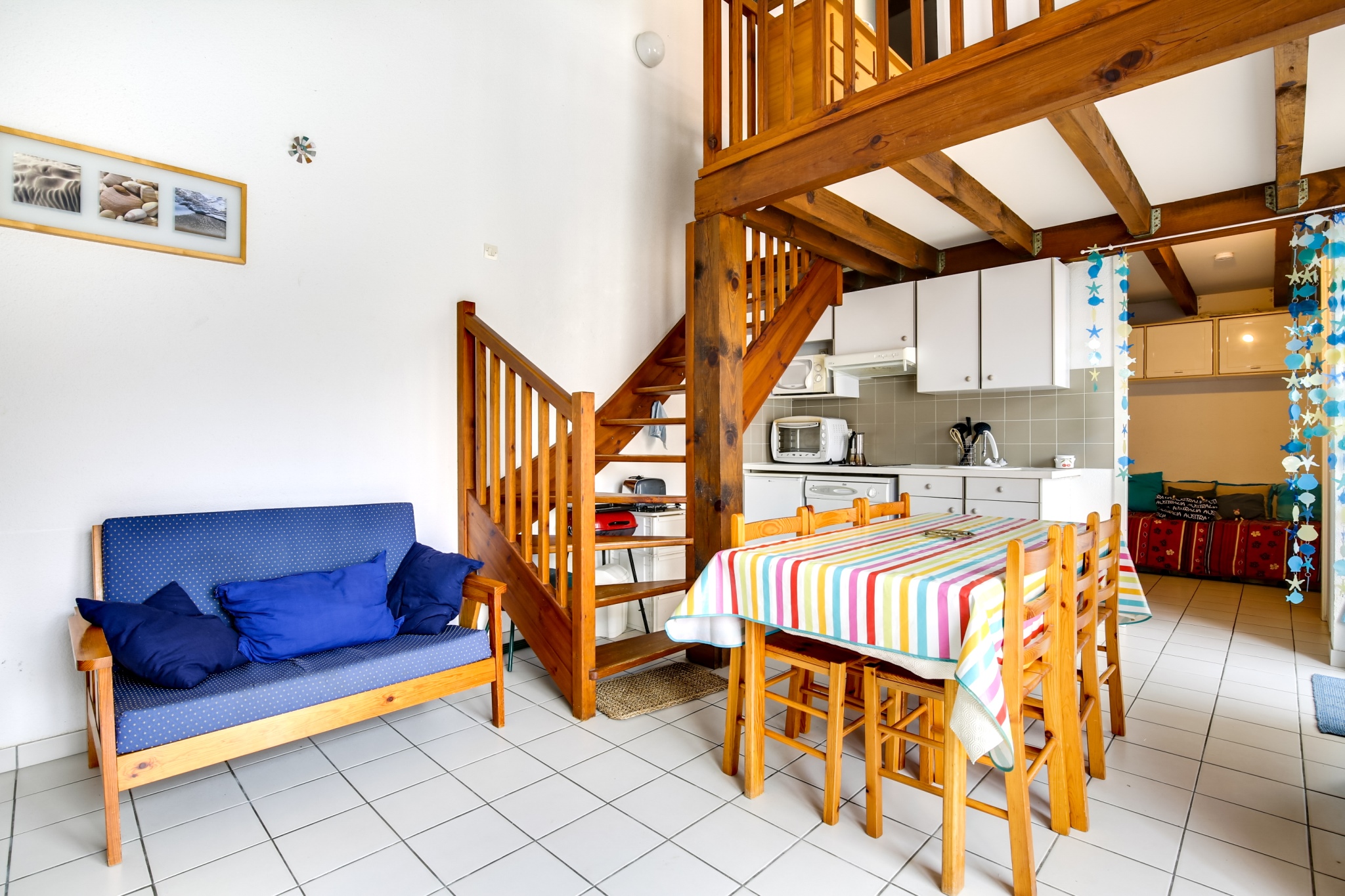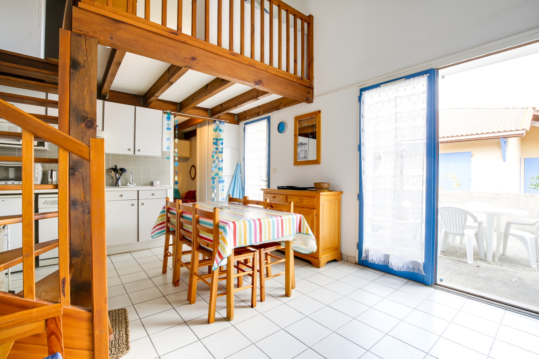 En bordure de dune, ensemble de maisons mitoyennes situés à 200m des plages et 700m du centre. Maison de 50m2 de type T3 cabine avec terrasse de 25m2 exposée EST. Composée d’un séjour avec Tv et banquette. Kitchenette équipée de plaques vitrocéramiques, hotte, réfrigérateur/Top, lave-vaisselle, lave linge, micro-onde, four, cafetière Nespresso, 1 bouilloire. Une chambre avec un lit double (140). Dégagement avec un lit simple (90) et placard. Salle de bain. WC indépendant. A l’étage une chambre avec un lit double (140) et armoire, cabine avec trois lits simples (90), mezzanine.