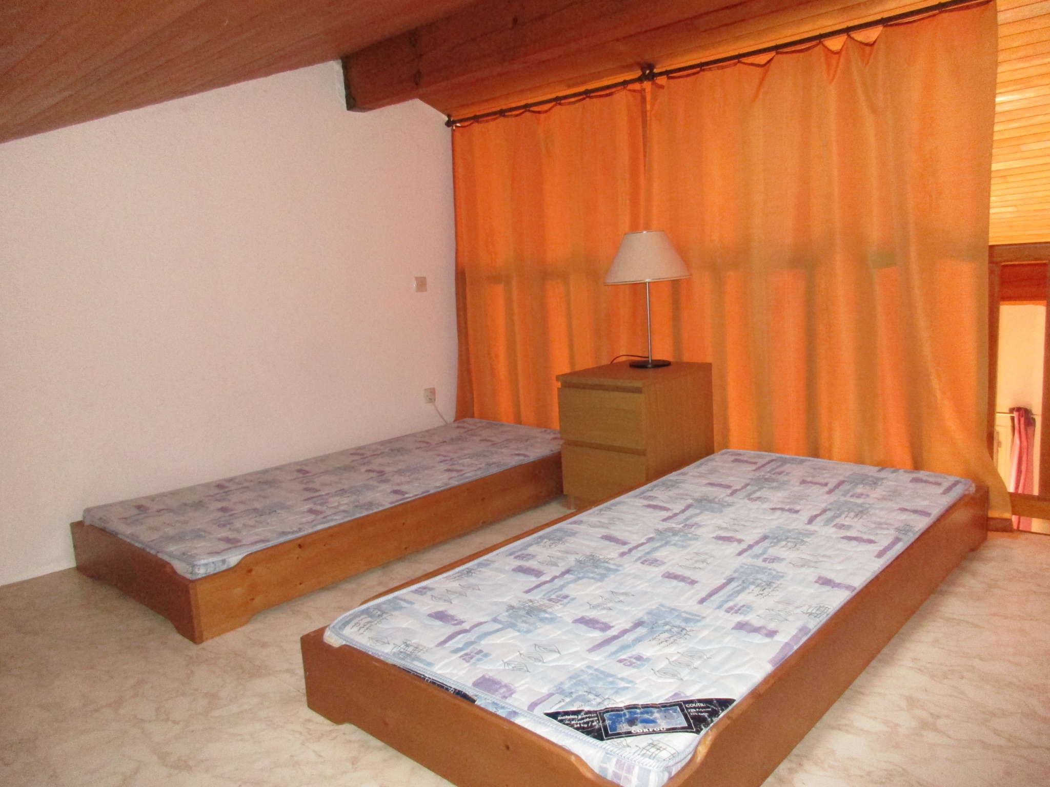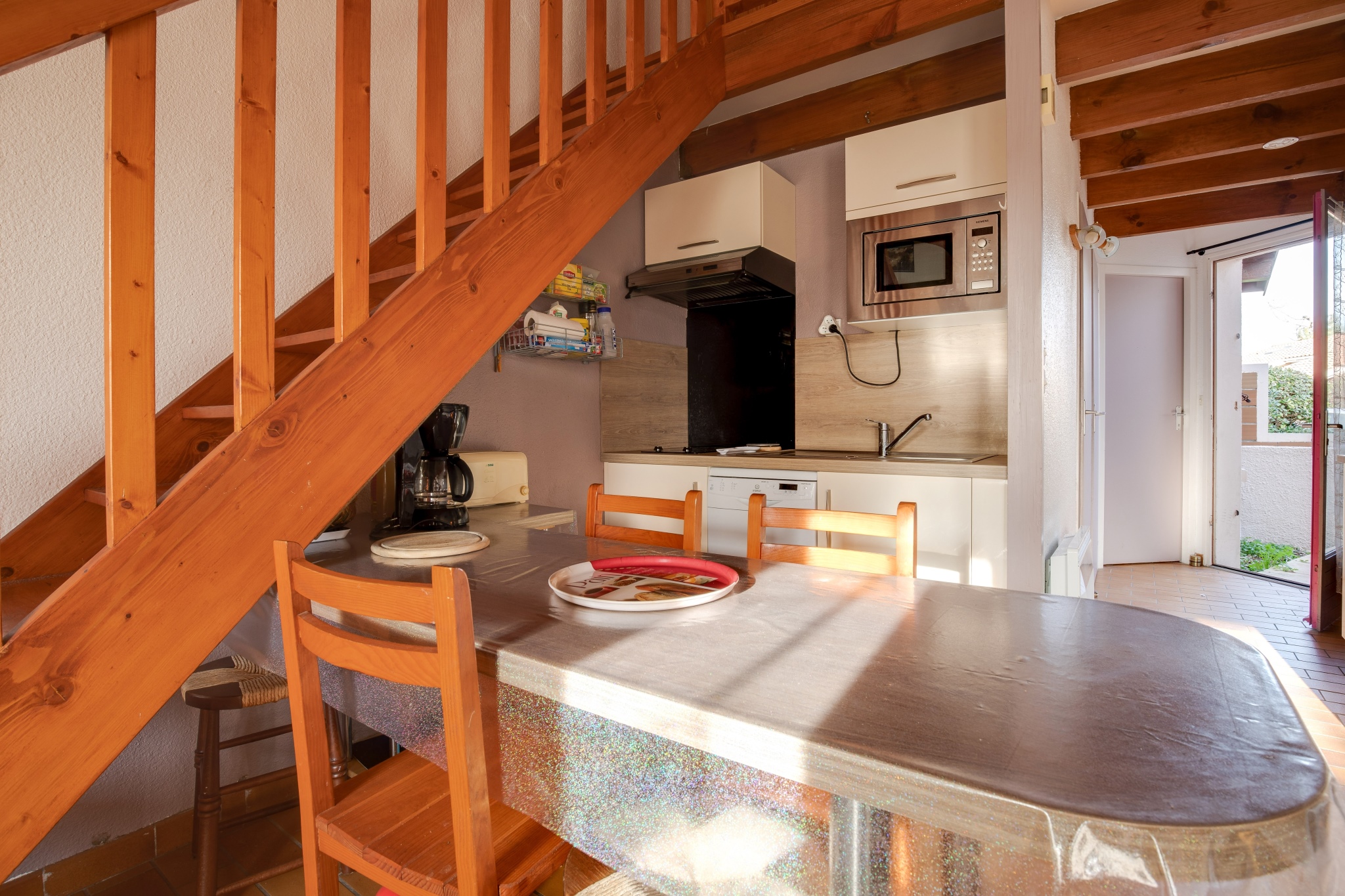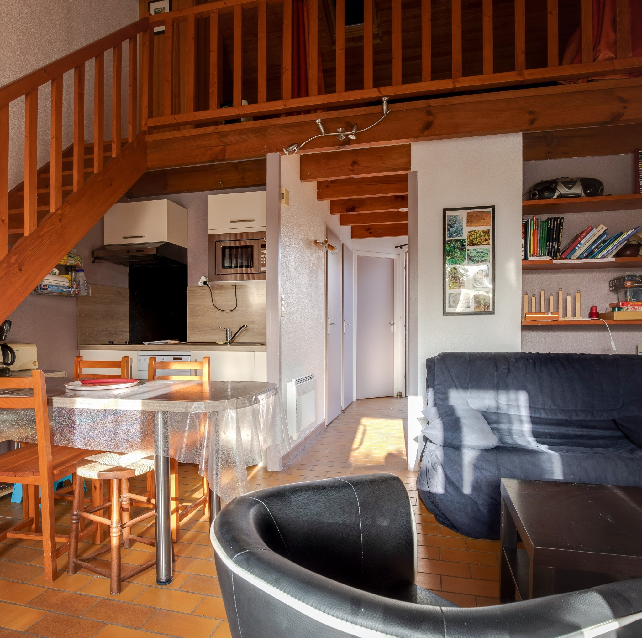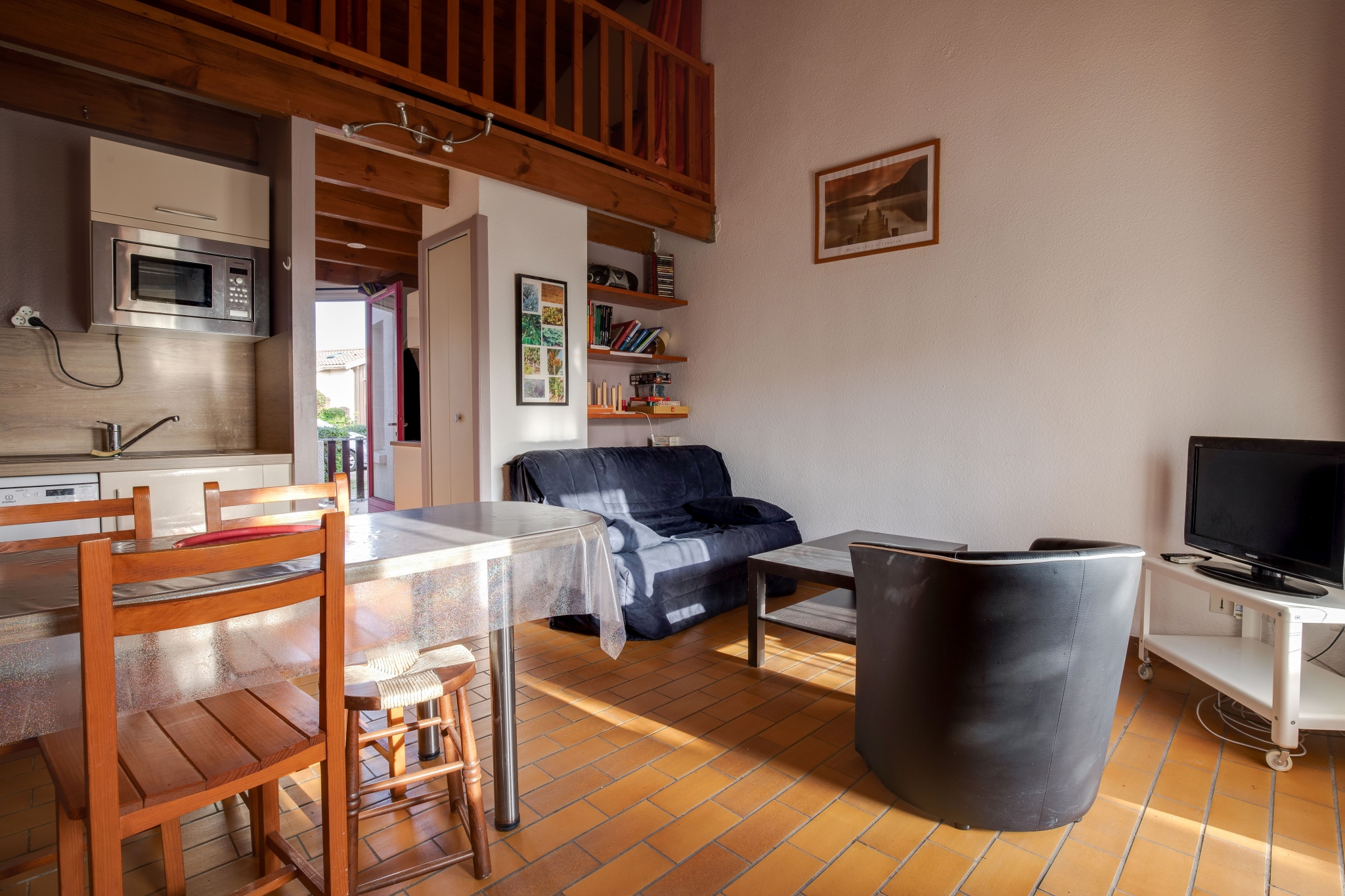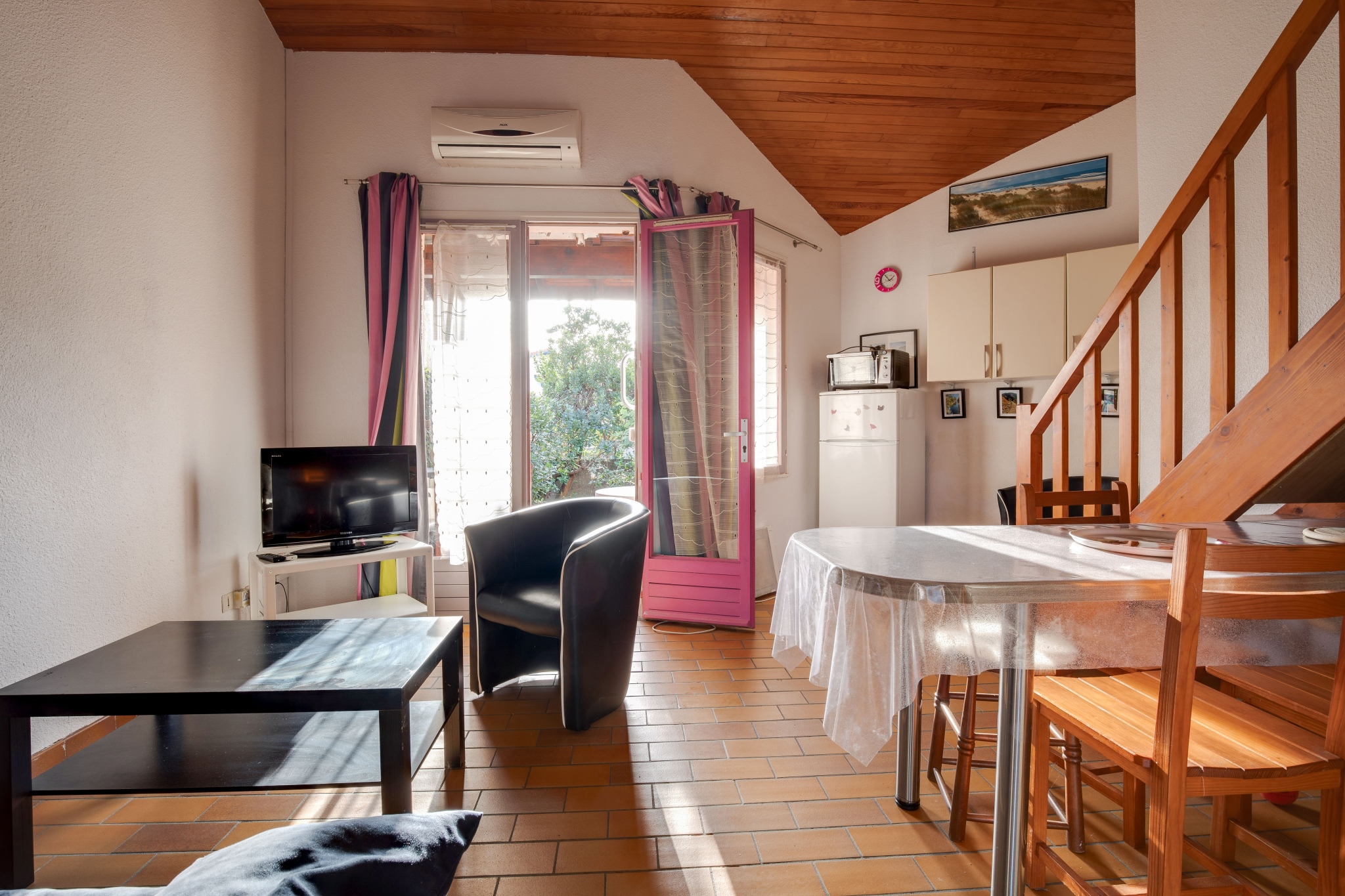 One-bedroom adjoining house with a mezzanine, composed of a living room with a TV.