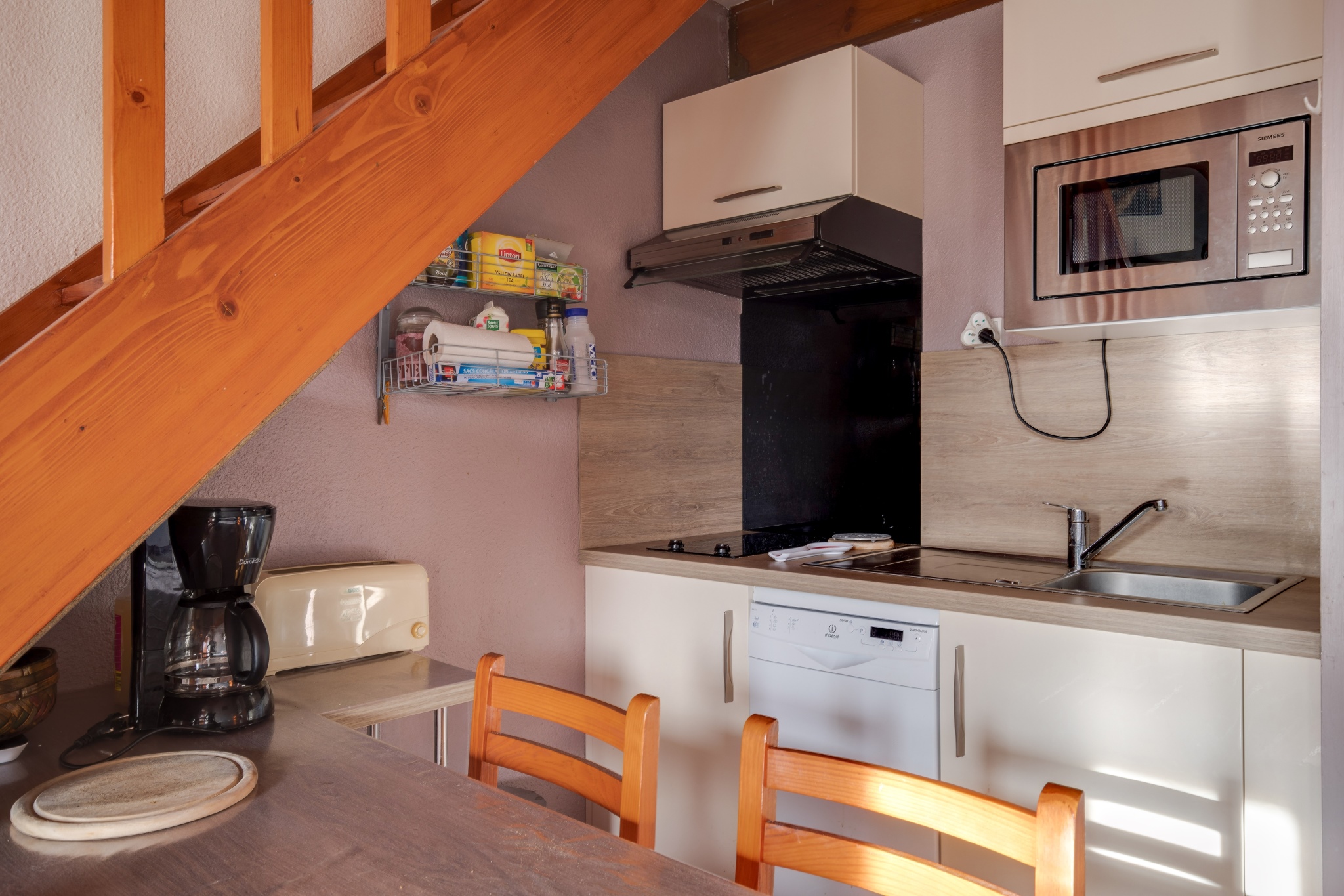 Open-plan kitchen equipped with an electric cooktop, a hood, an oven and a microwave, a coffee maker, a toaster, a kettle, a fridge and a dish-washer.