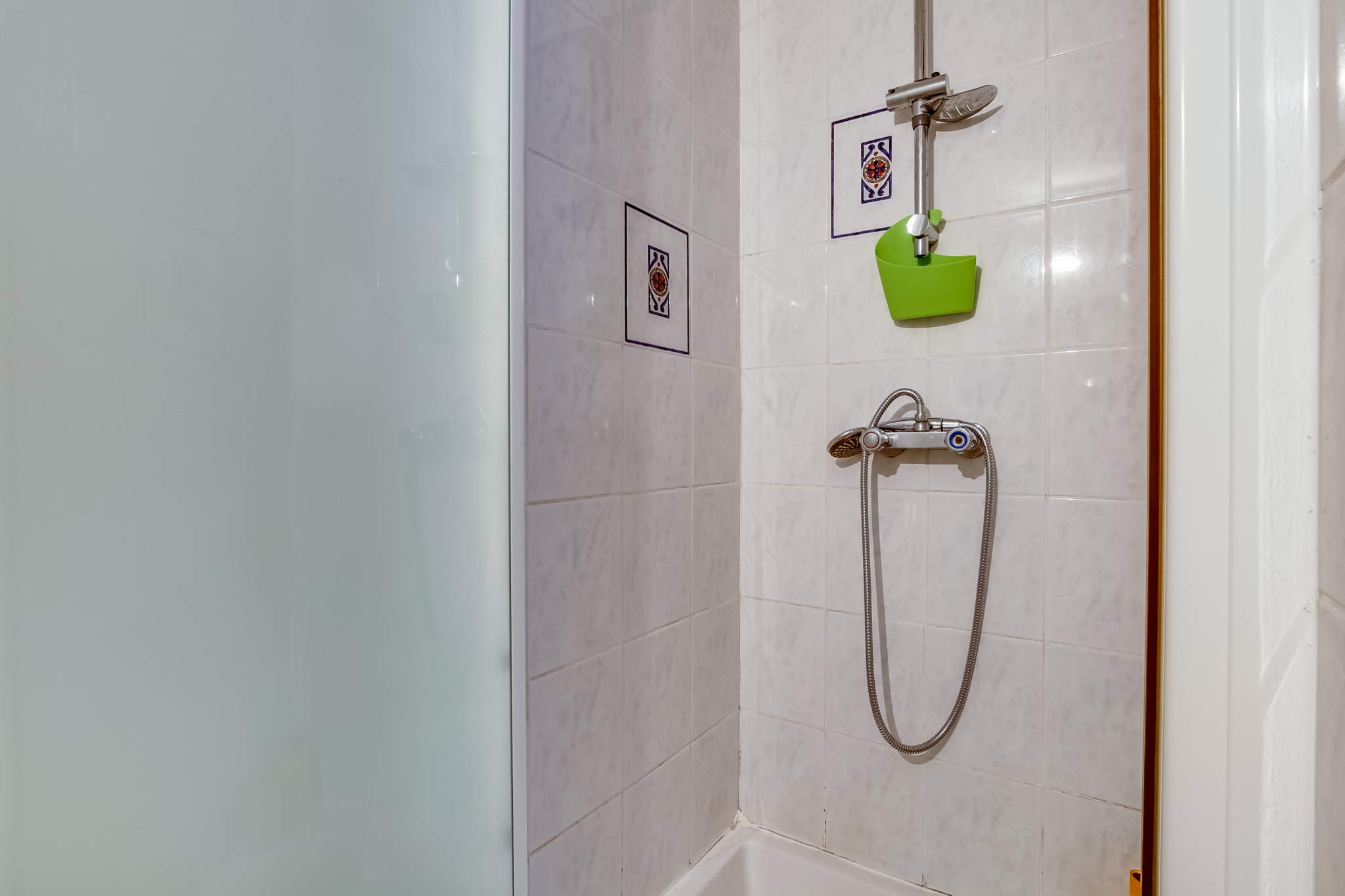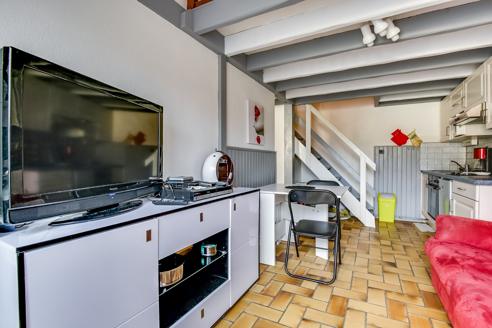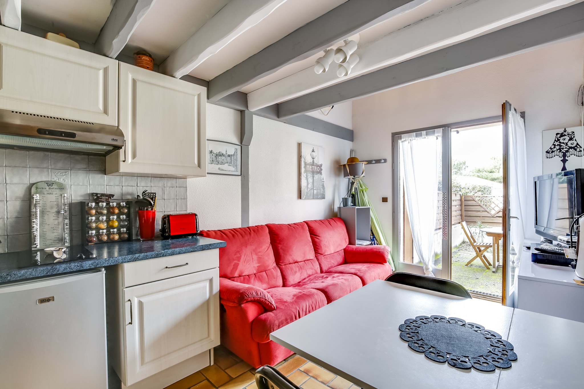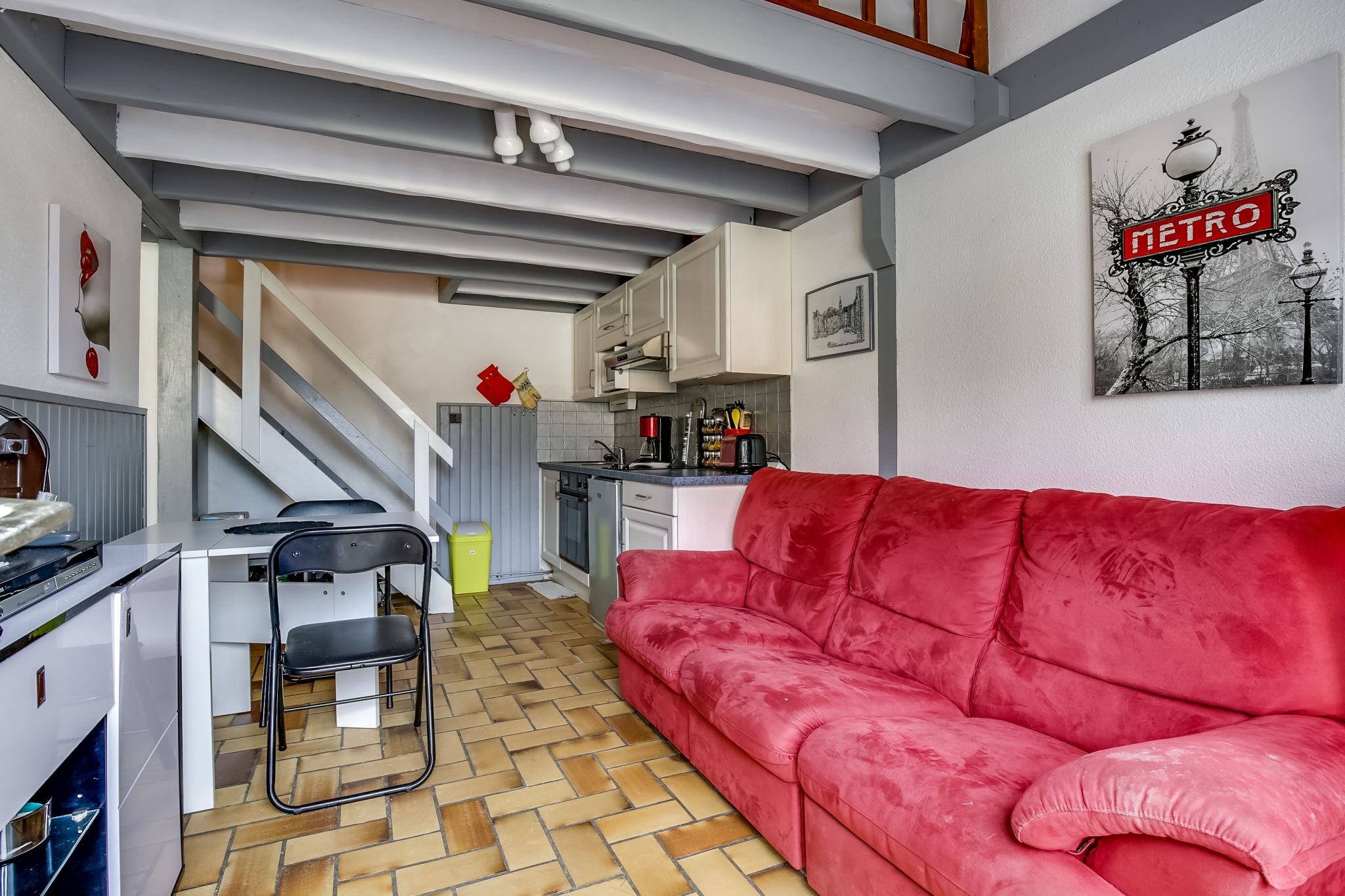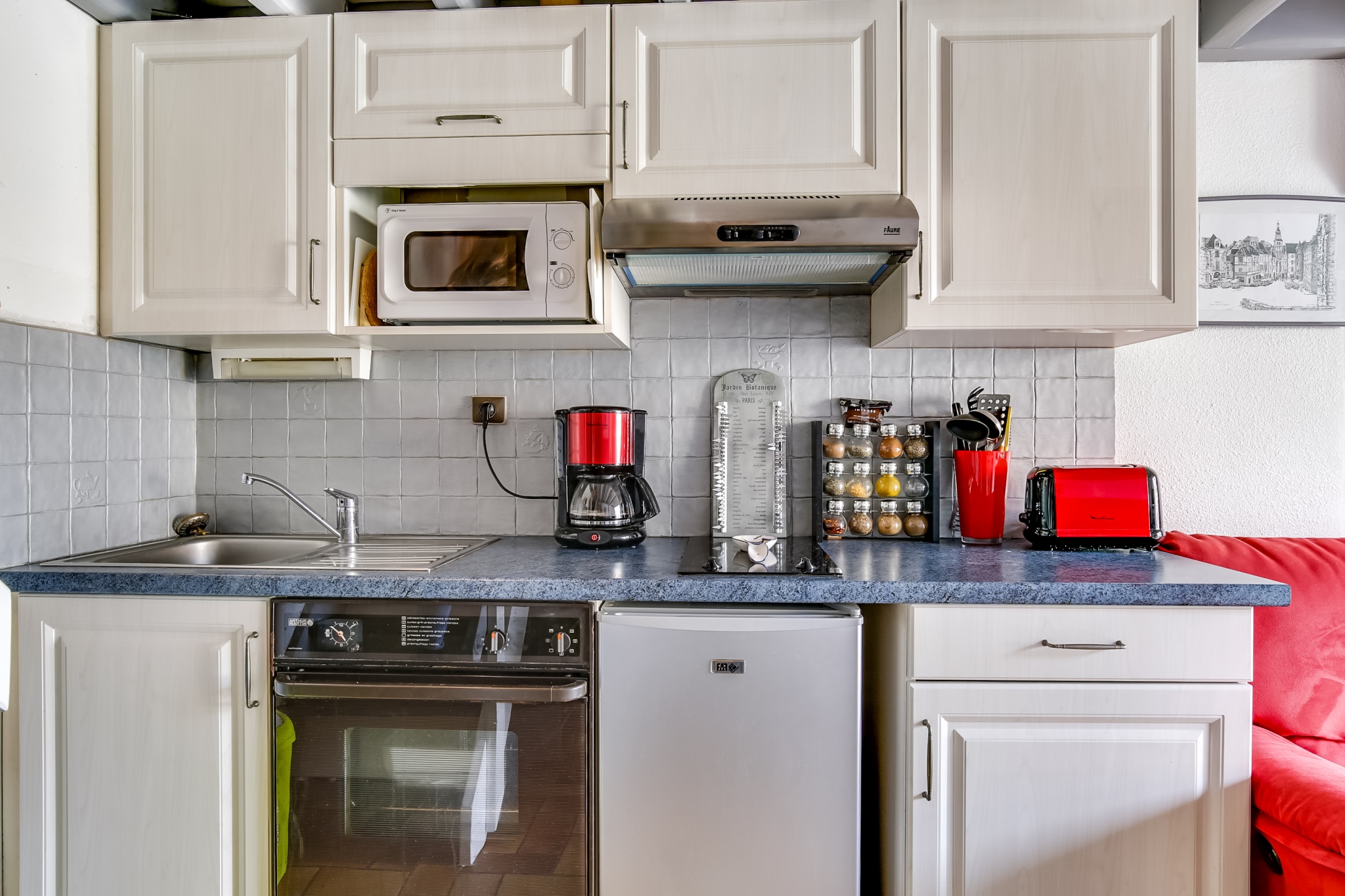 It is composed of a living room with a kitchenette equipped with two electric rings, an oven and a microwave, and a fridge.
