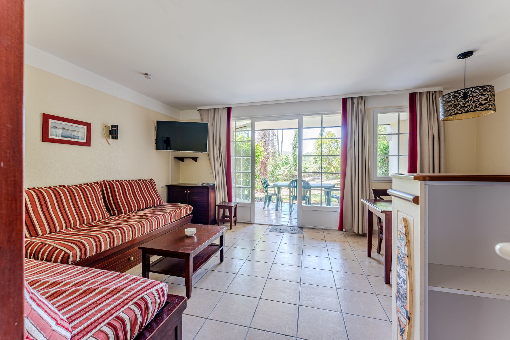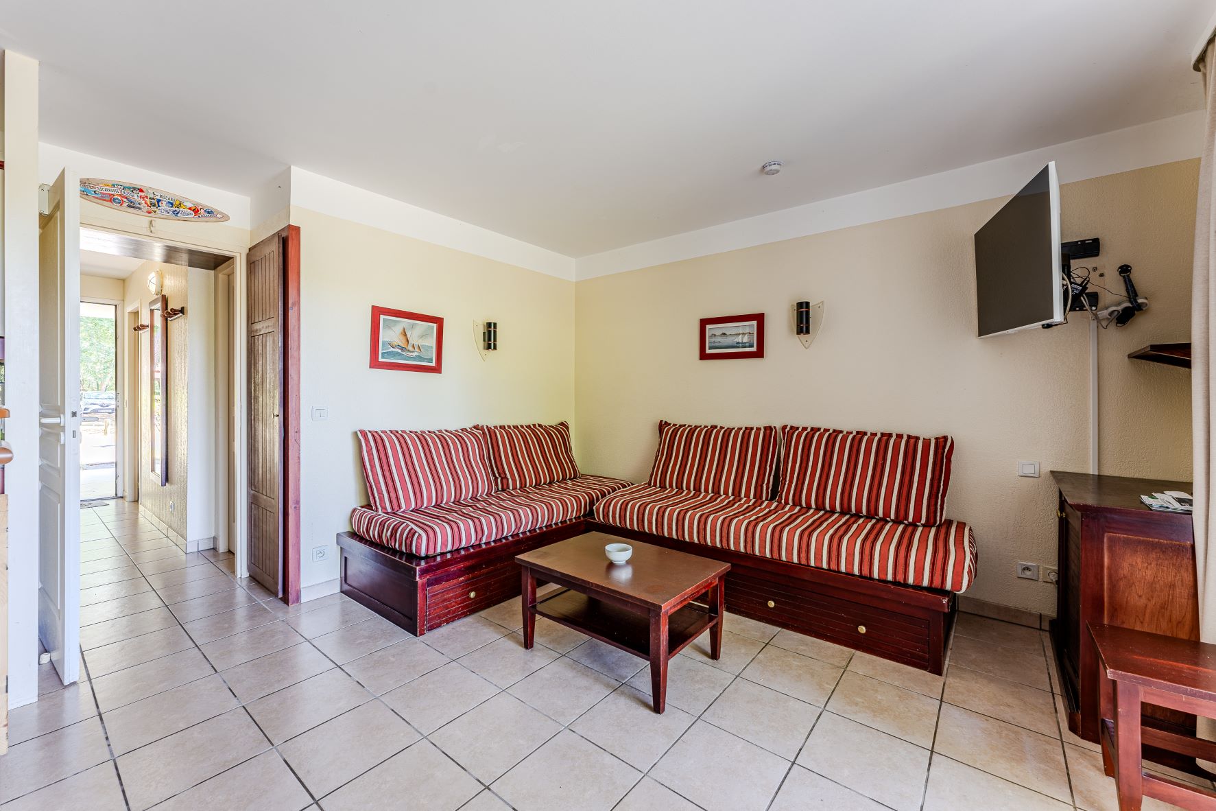 Au sein d'une résidence de tourisme, bel appartement en rez de jardin, avec vue golf, au pied du golf, à 800m du lac et 200m des pistes cyclables. Appartement 5 personnes, avec une chambre avec un lit 140/190, un coin nuit avec 1 lit 90/190, une salle de bain, une salle de douche avec WC, un séjour avec 2 banquettes-lits, une cuisine ouverte, avec lave-vaisselle, plaques vitro-céramiques, réfrigérateur, le tout donnant sur une grande terrasse abritée avec mobilier de jardin.