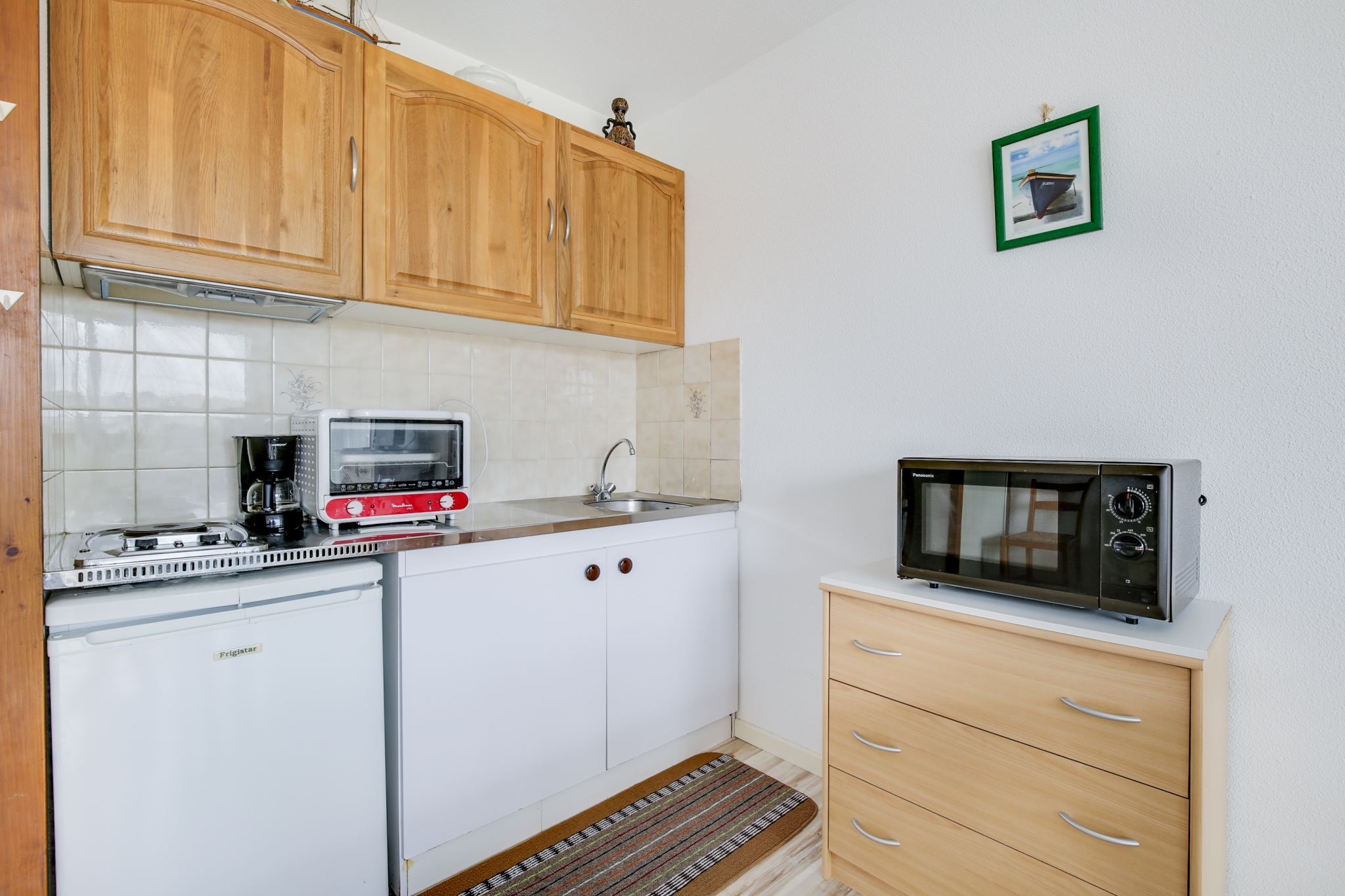 Cuisine ouverte équipée de plaques de cuisson électriques, hotte, micro-onde, mini four, cafetière et frigo top. Salle d’eau avec WC.