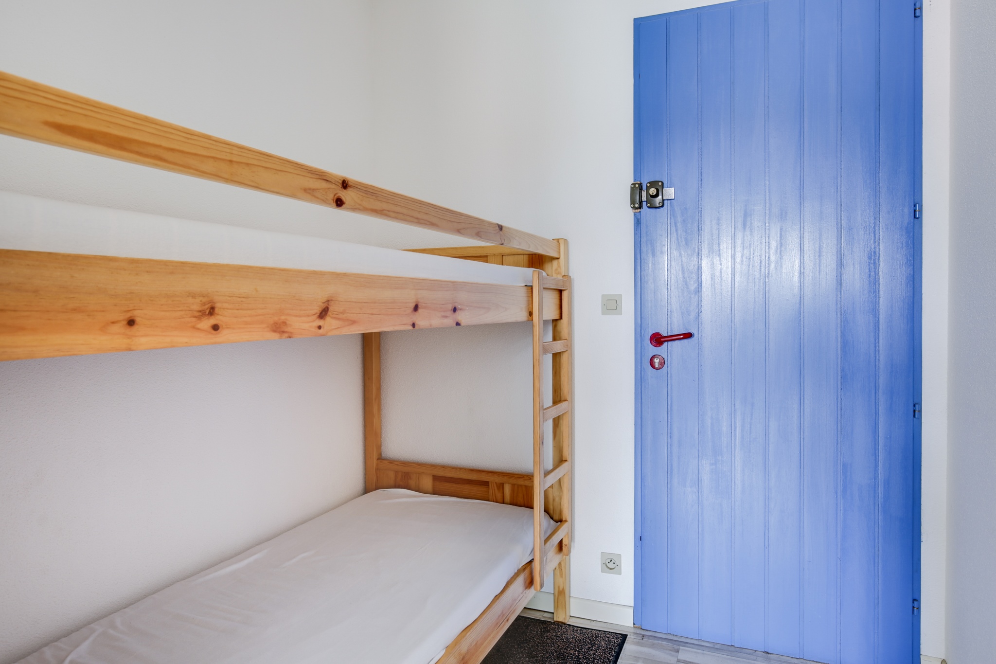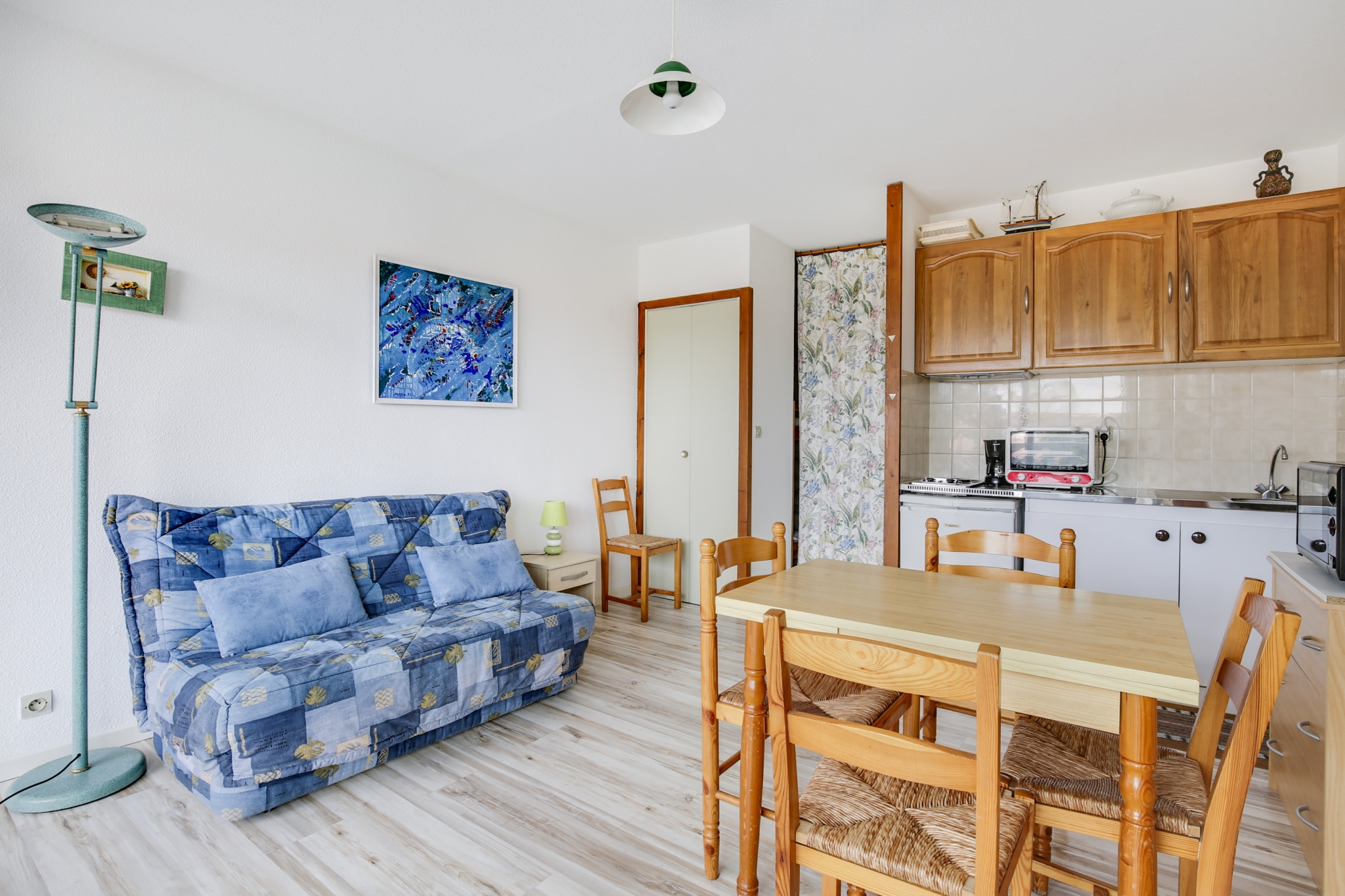 Dans une petite résidence de 2 étages. Agréable et spacieux studio cabine de 25 m2, bien agencé, avec deux lits 1 place superposés dans l’entrée. Salon séjour avec téléviseur et canapé convertible offrant un couchage 2 places, ouvrant sur un balcon de plus de 8 m2 exposé plein sud. Capacité de couchage pour 4 personnes maximum.
