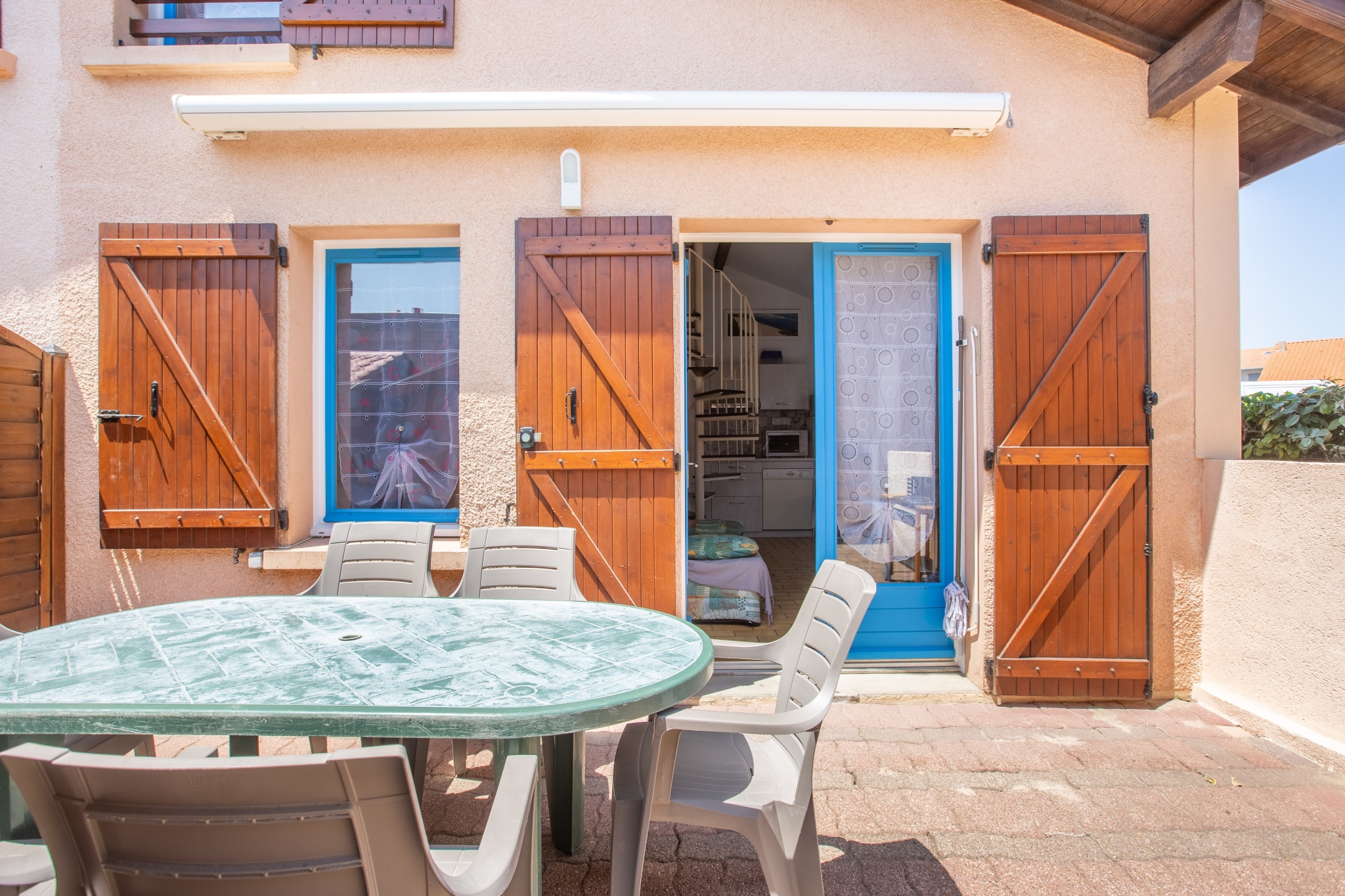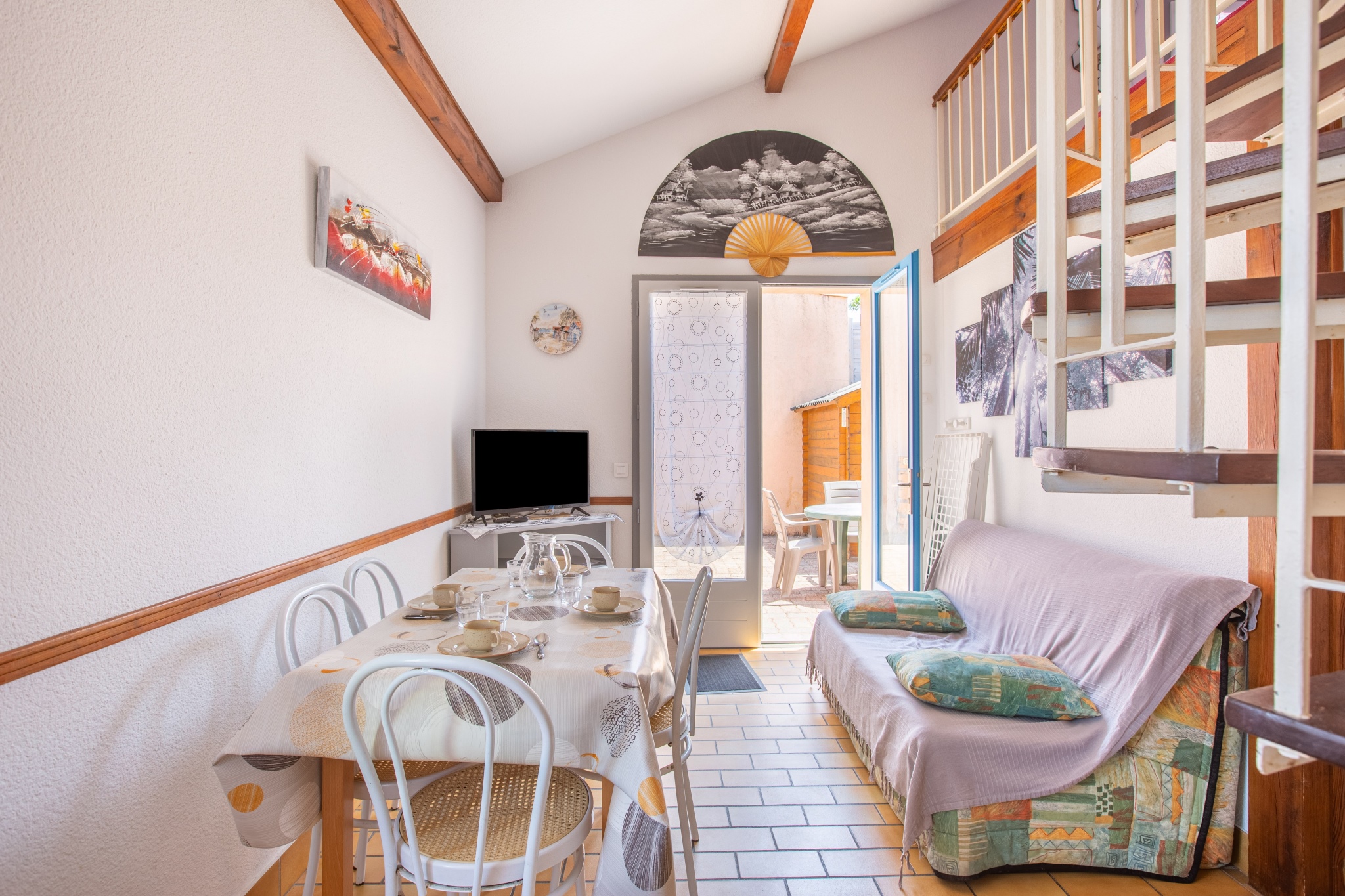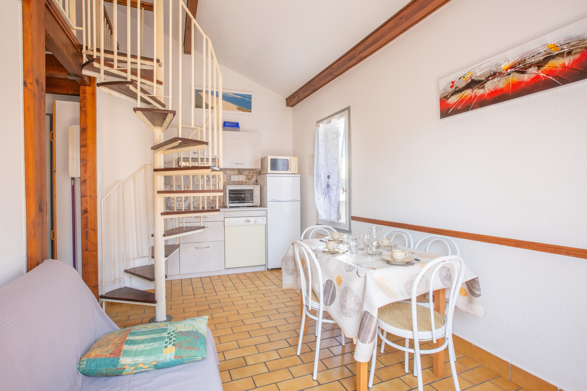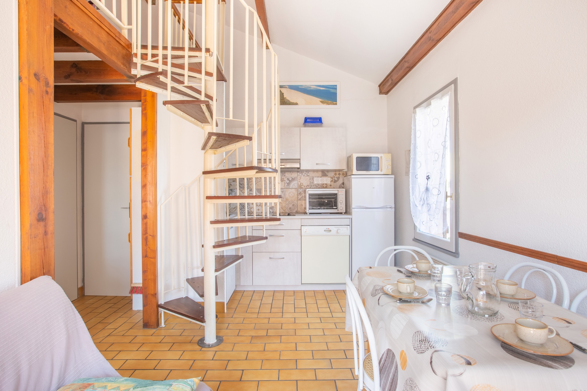 Dans une petite résidence composée d’appartements et de maisons mitoyennes, maison jumelée de type T2 mezzanine composée d’un salon salle à manger avec TV donnant sur une cour exposée SUD-EST. Cuisine ouverte équipée de plaques vitrocéramique, hotte, four, cafetière,cafetière à dosettes, micro-onde, lave-vaisselle, réfrigérateur/congélateur. Une chambre avec un lit double (140) et placard. Salle d’eau. WC indépendant. A l’étage, mezzanine avec deux lits doubles (140) et penderie.