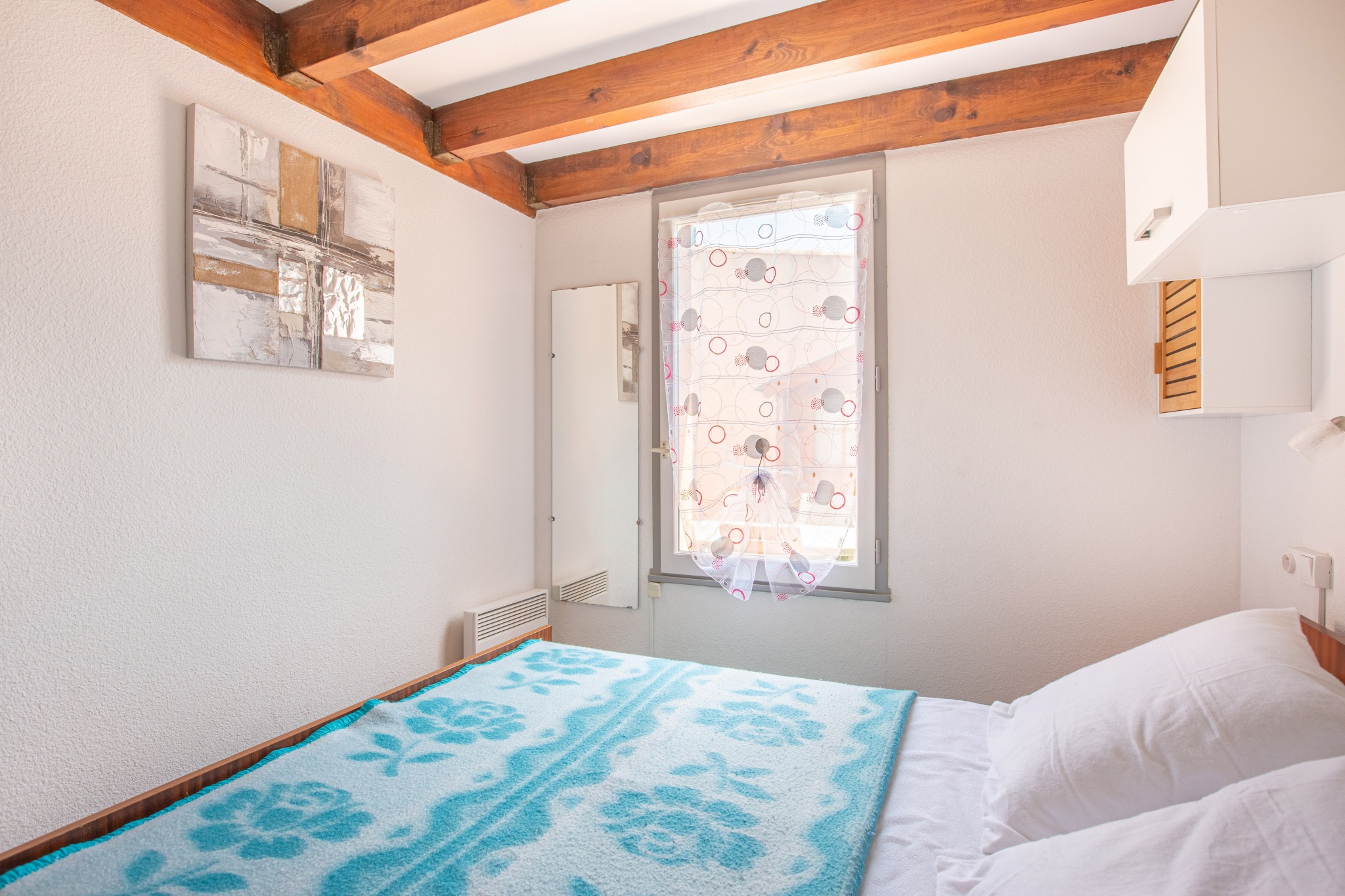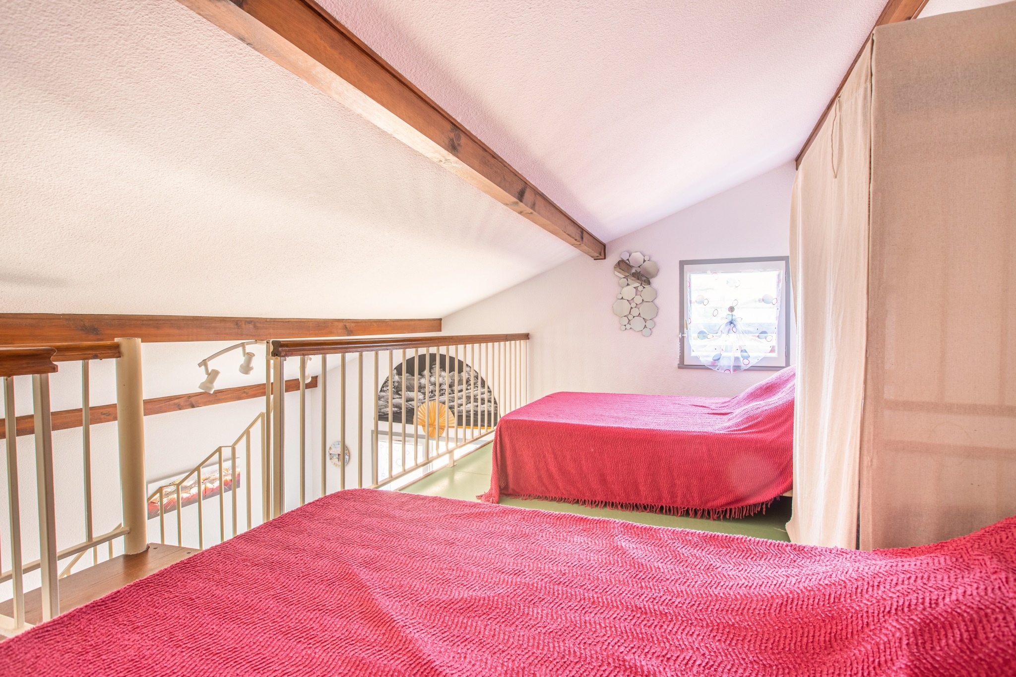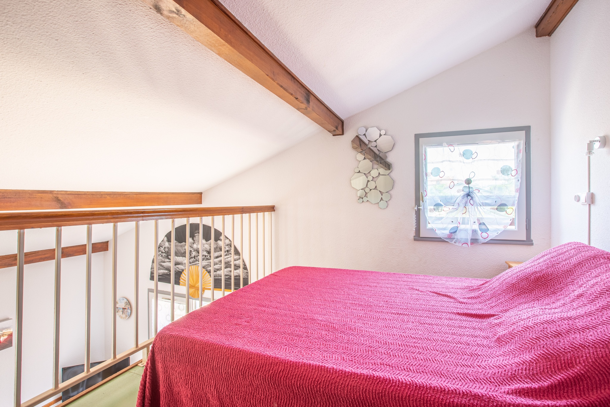 Dans une petite résidence composée d’appartements et de maisons mitoyennes, maison jumelée de type T2 mezzanine composée d’un salon salle à manger avec TV donnant sur une cour exposée SUD-EST. Cuisine ouverte équipée de plaques vitrocéramique, hotte, four, cafetière,cafetière à dosettes, micro-onde, lave-vaisselle, réfrigérateur/congélateur. Une chambre avec un lit double (140) et placard. Salle d’eau. WC indépendant. A l’étage, mezzanine avec deux lits doubles (140) et penderie.