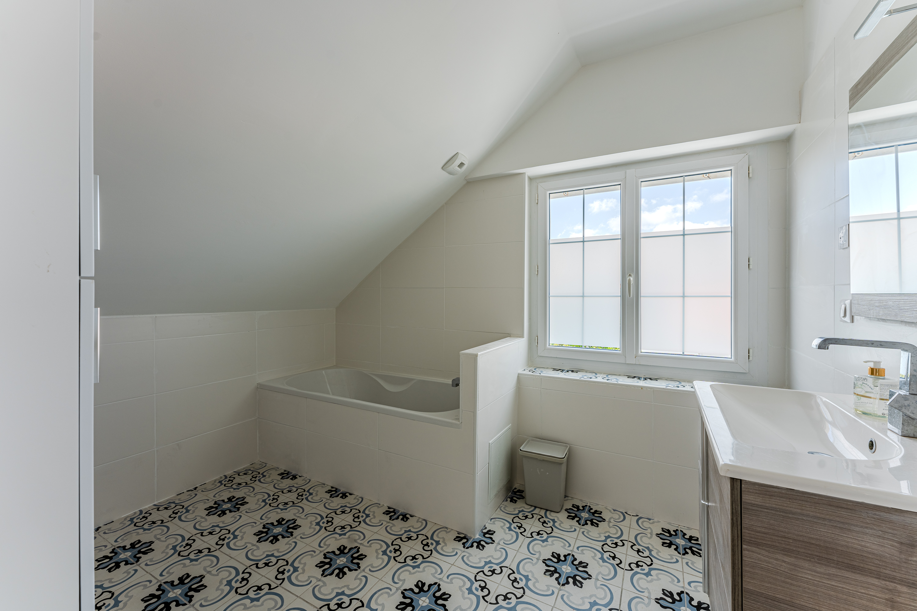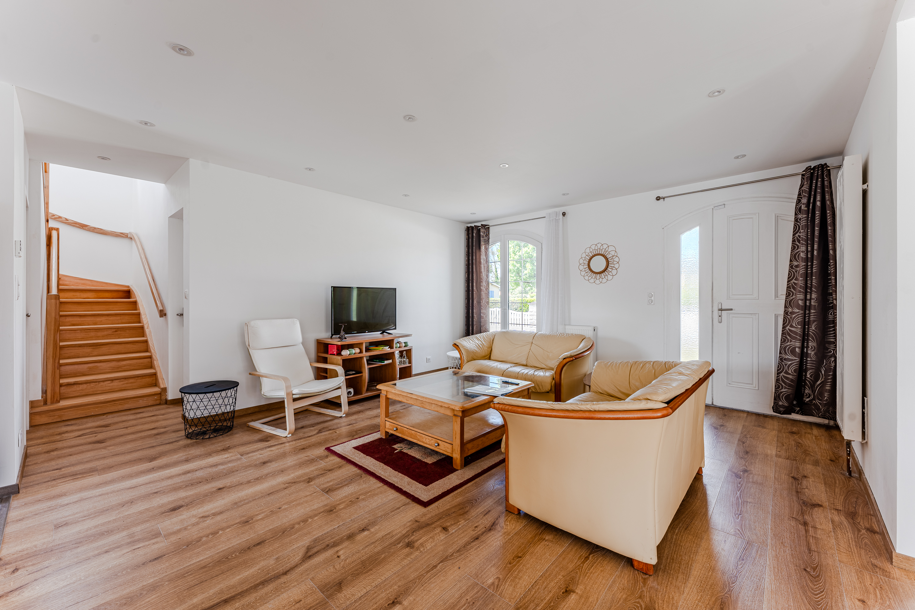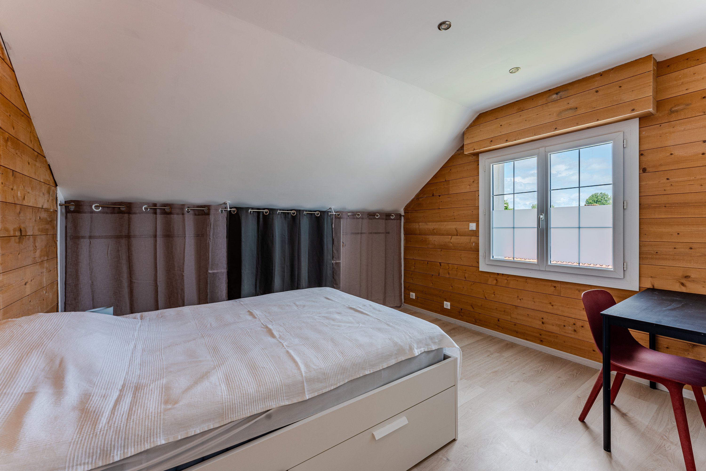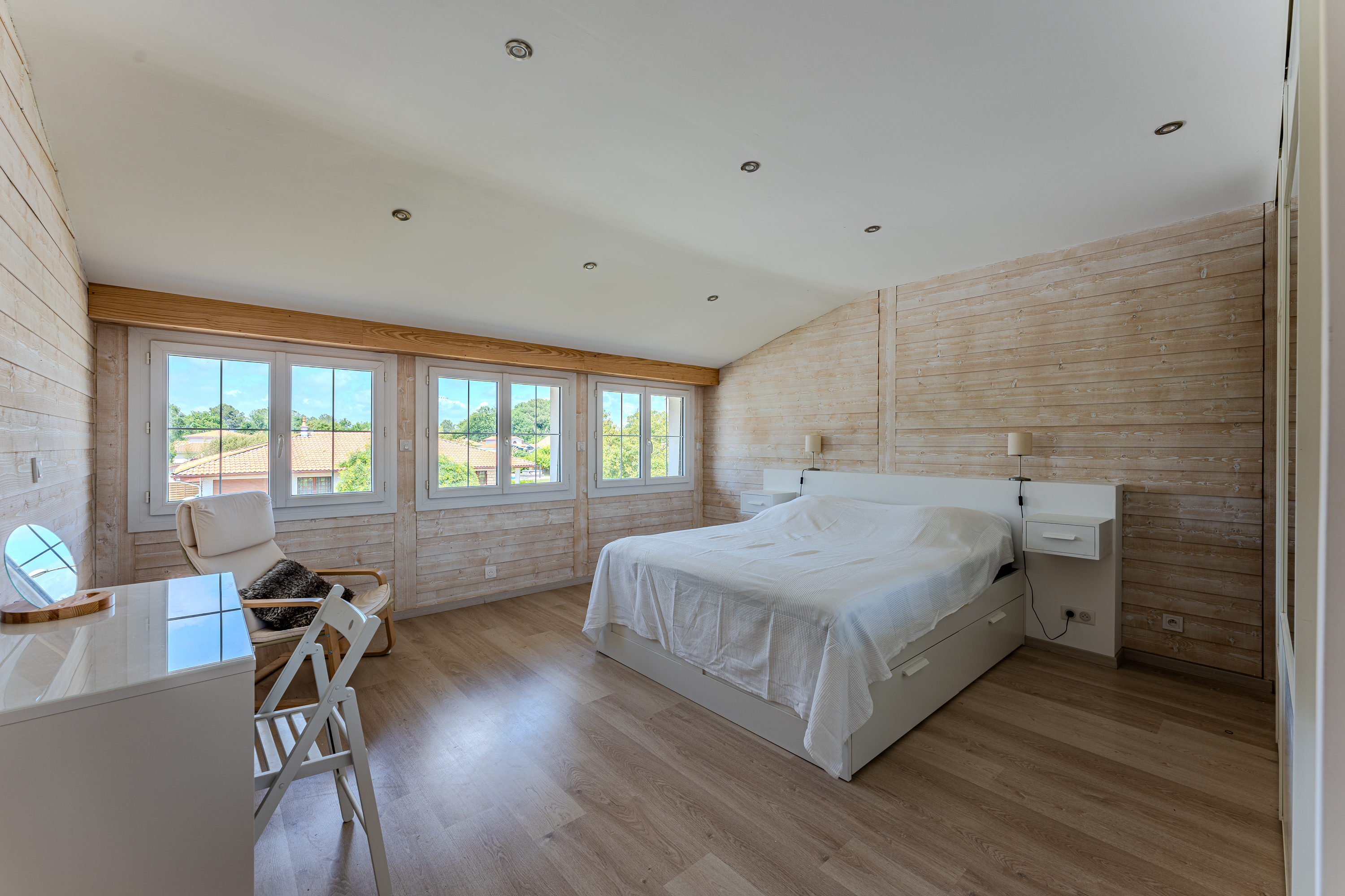 A l' étage : 2 chambres avec un lit 140*200, dressing, 1 chambre de 25m2 avec un lit de 160x200 avec placards et bureau, salle de bain et WC, 1chambre avec un lit en 160*200.