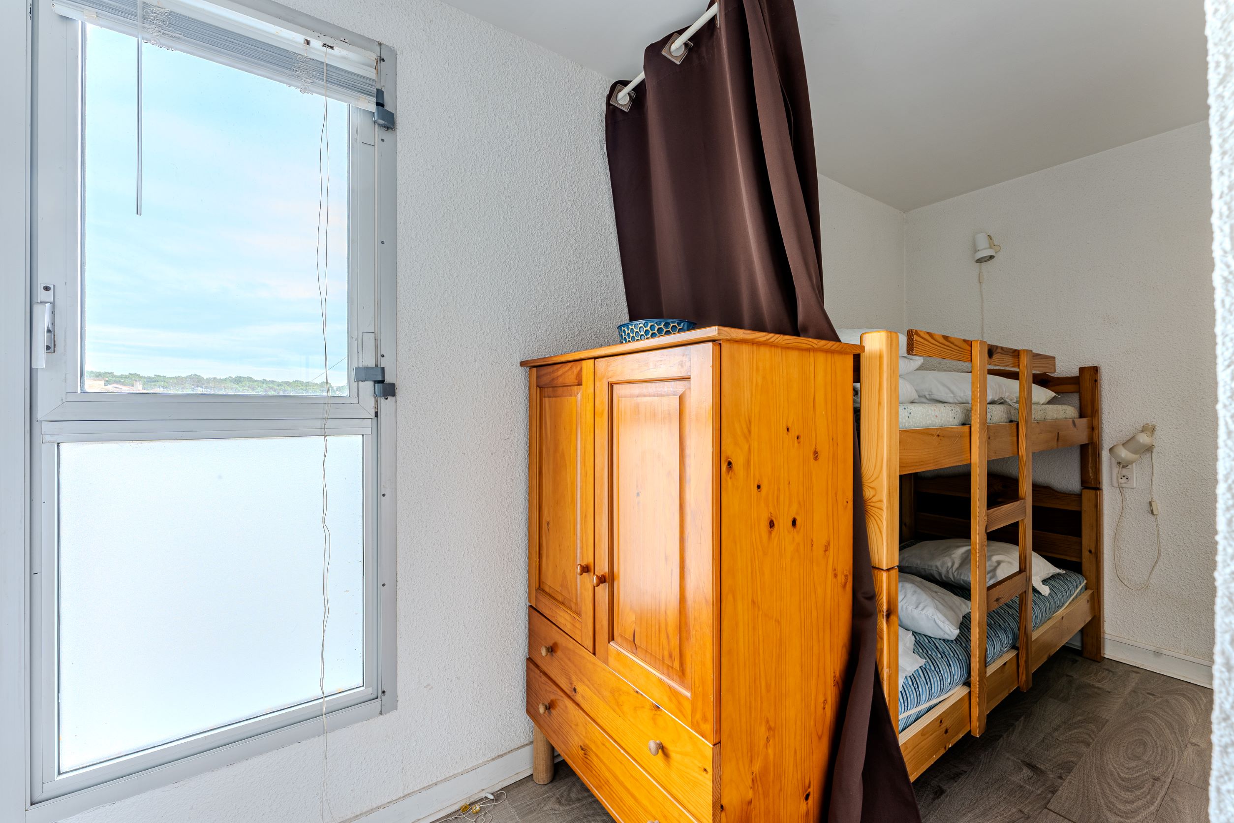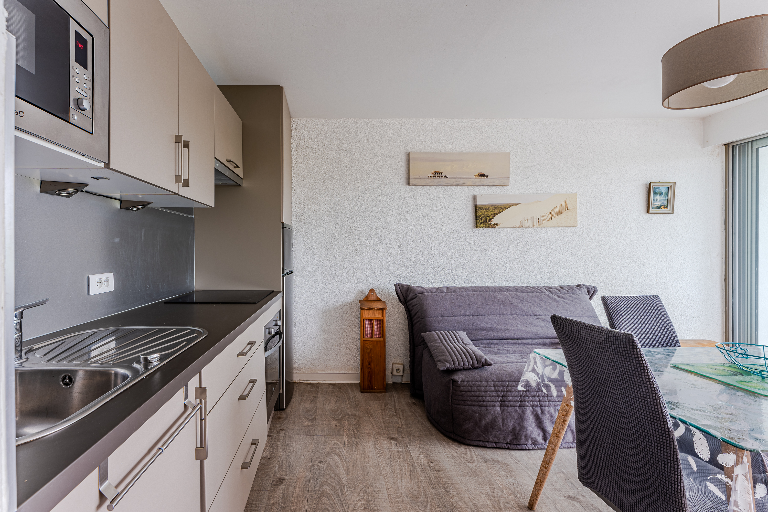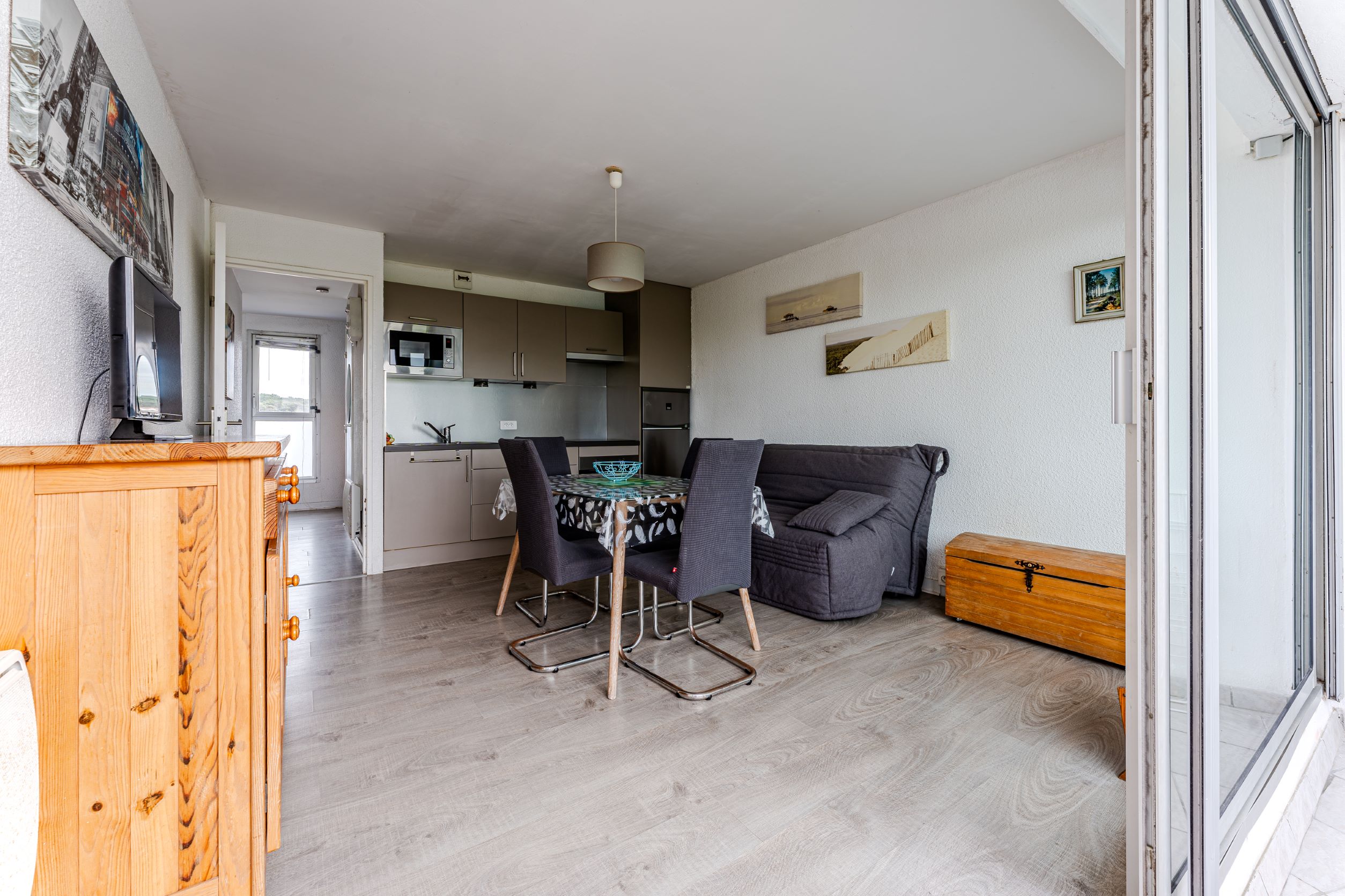 REF : 118ATLA - Studio cabine au 1er étage avec ascenseur, situé en front de mer. Séjour avec 1 canapé convertible 2 places en 140, cuisine avec plaques vitrocéramiques, hotte,four-micro onde, réfrigérateur congélateur. loggia fermée .Cabine avec deux lits superposés en 90. Salle d'eau avec douche et lave linge . WC indépendant. Parking.