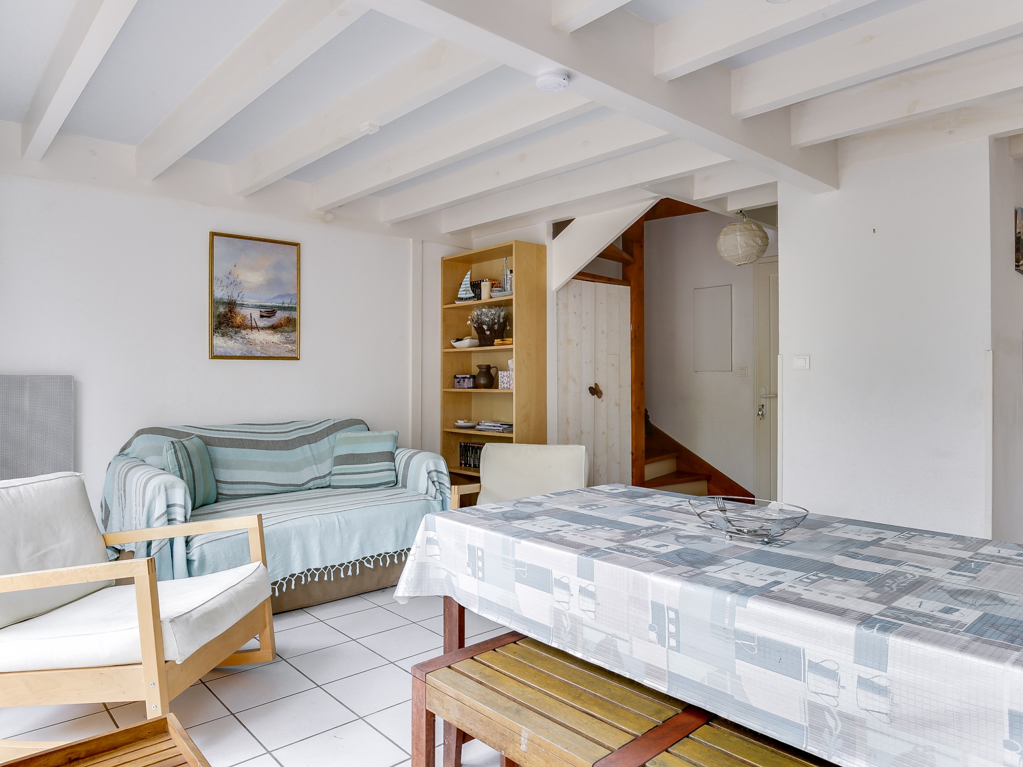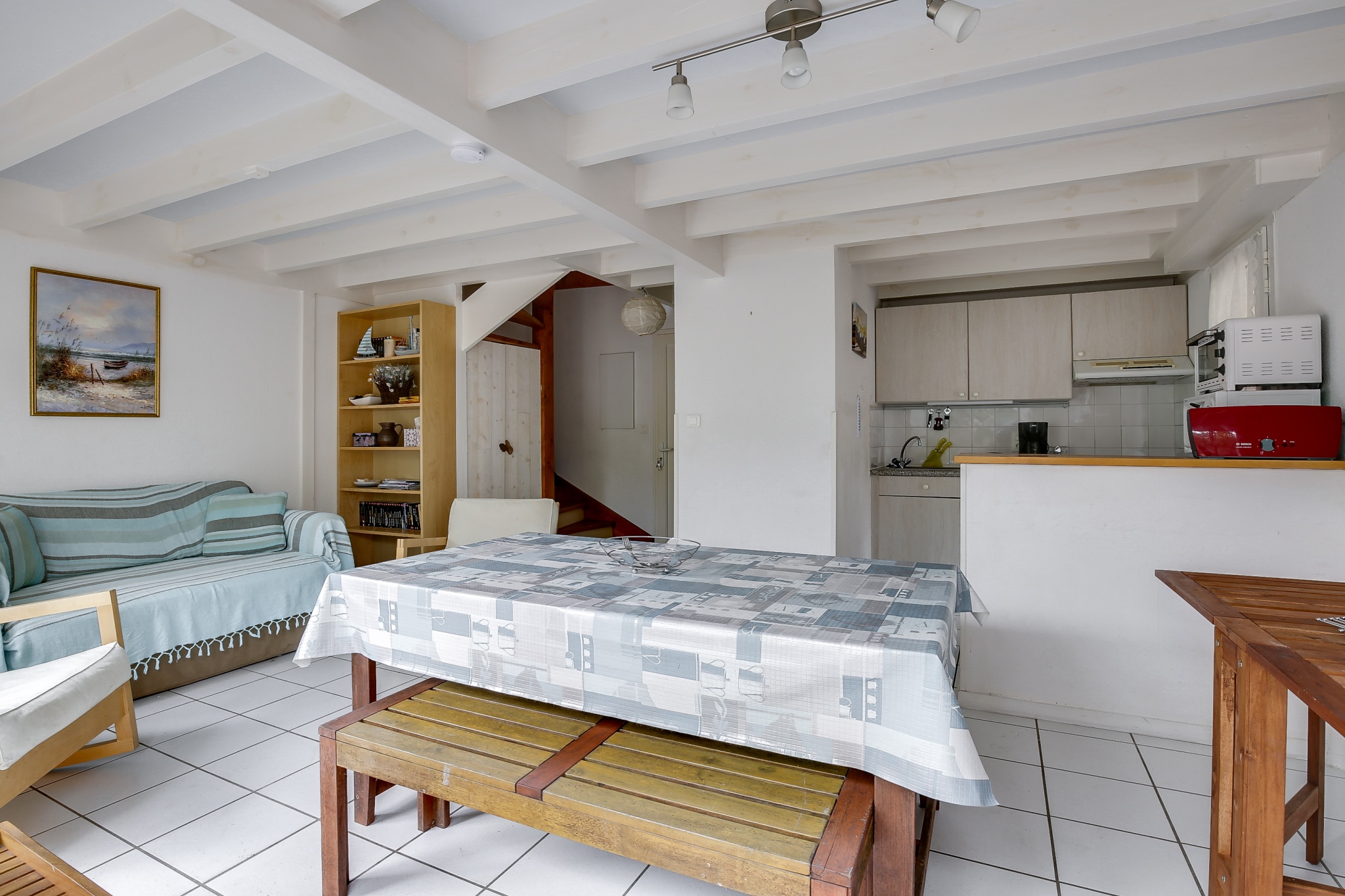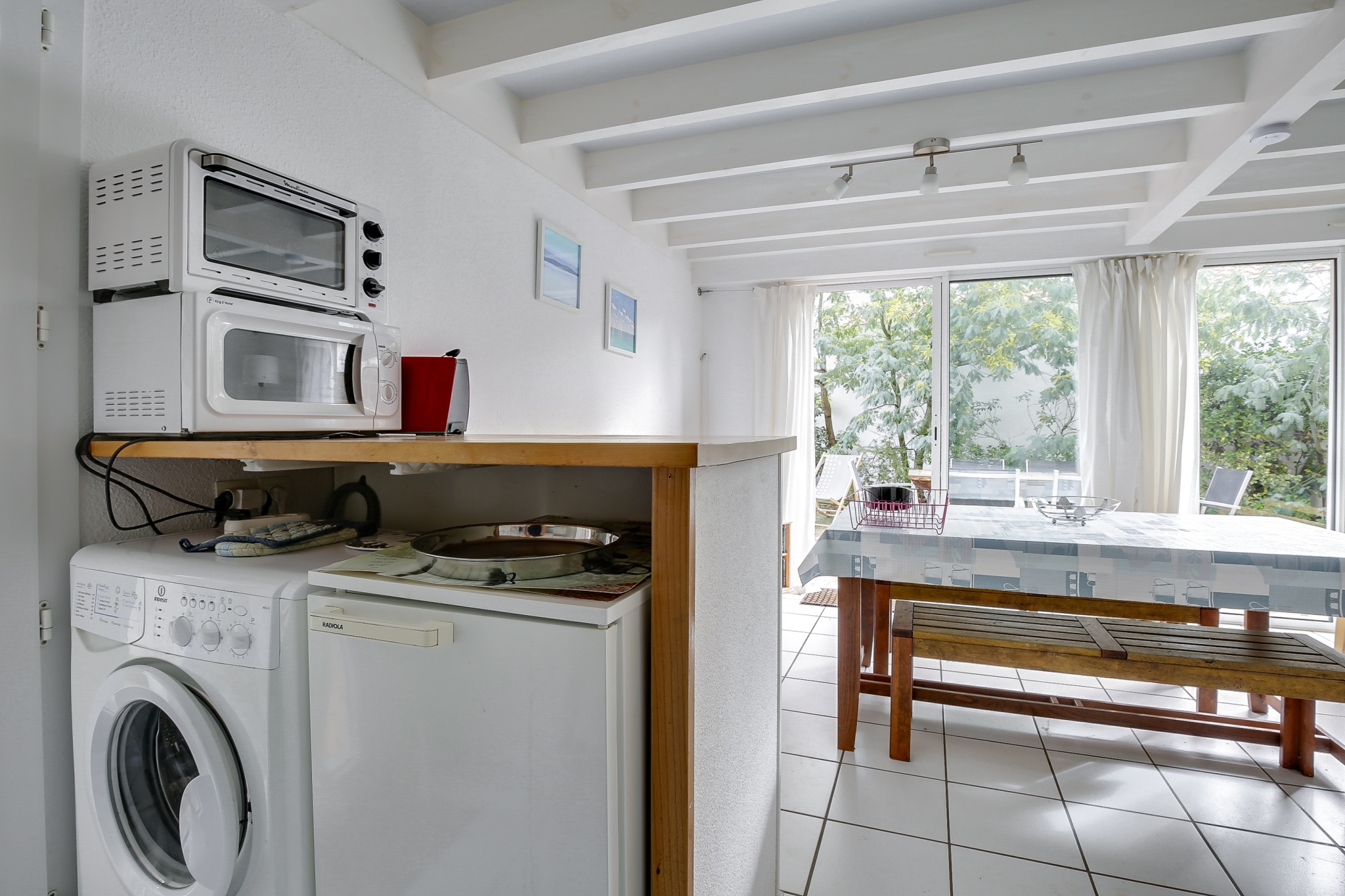 Cuisine ouverte donnant également sur une terrasse couverte exposée EST, équipée de plaques vitrocéramiques, hotte, micro-onde, cafetière, grille-pain, bouilloire, lave-linge et lave-vaisselle. A l’étage, 1 chambre avec un lit double (140) et 1 chambre avec 2 lits doubles superposés(140). Nombreux rangements. Lit Parapluie. Salle de bains. WC indépendant. A l’extérieur, agréable jardin paysagé avec barbecue, et salon de jardin.