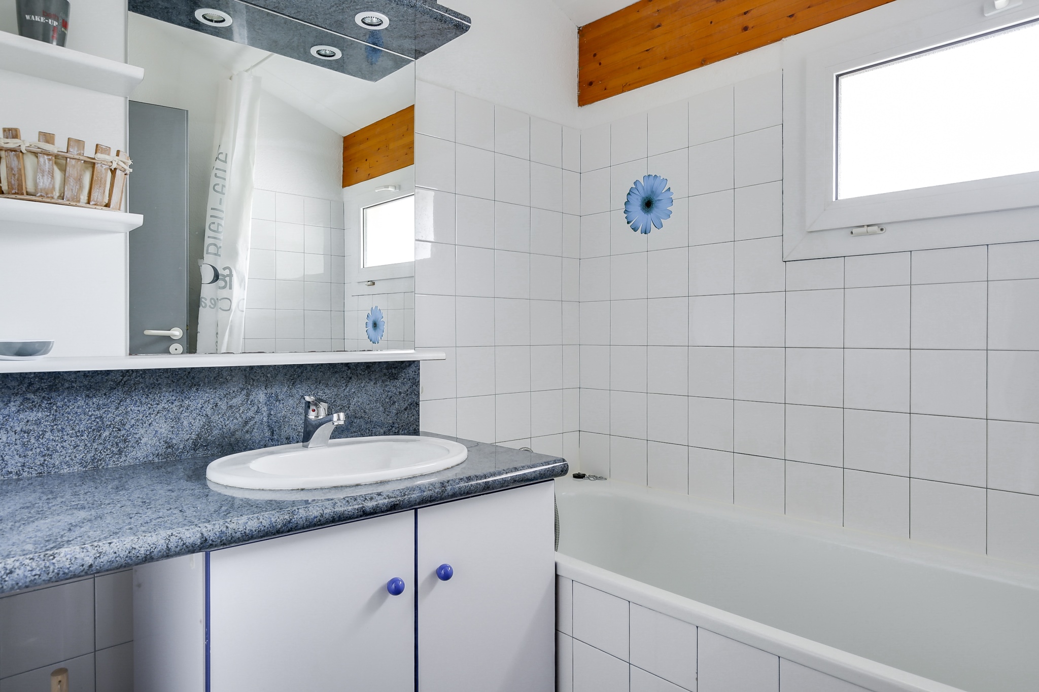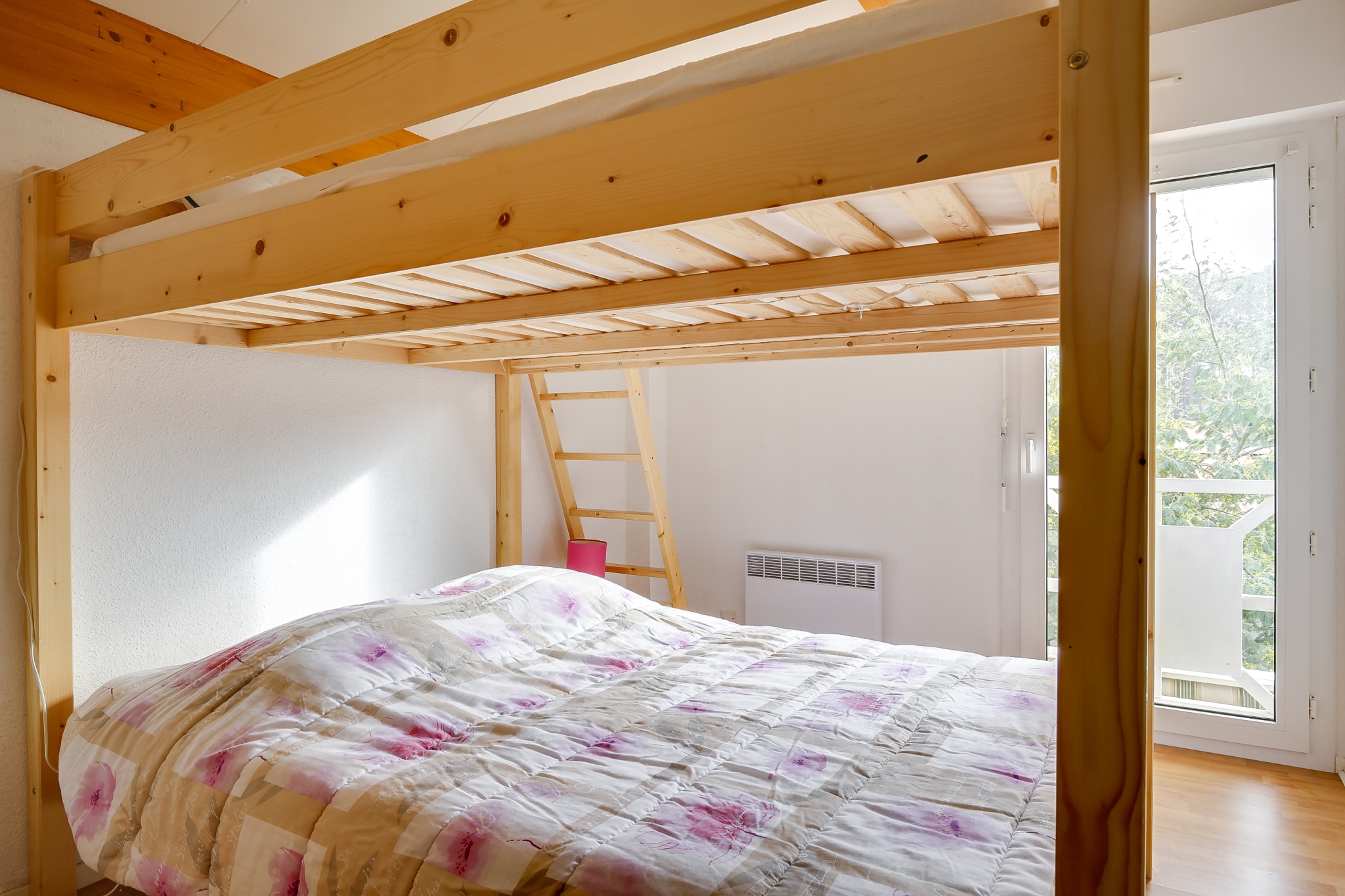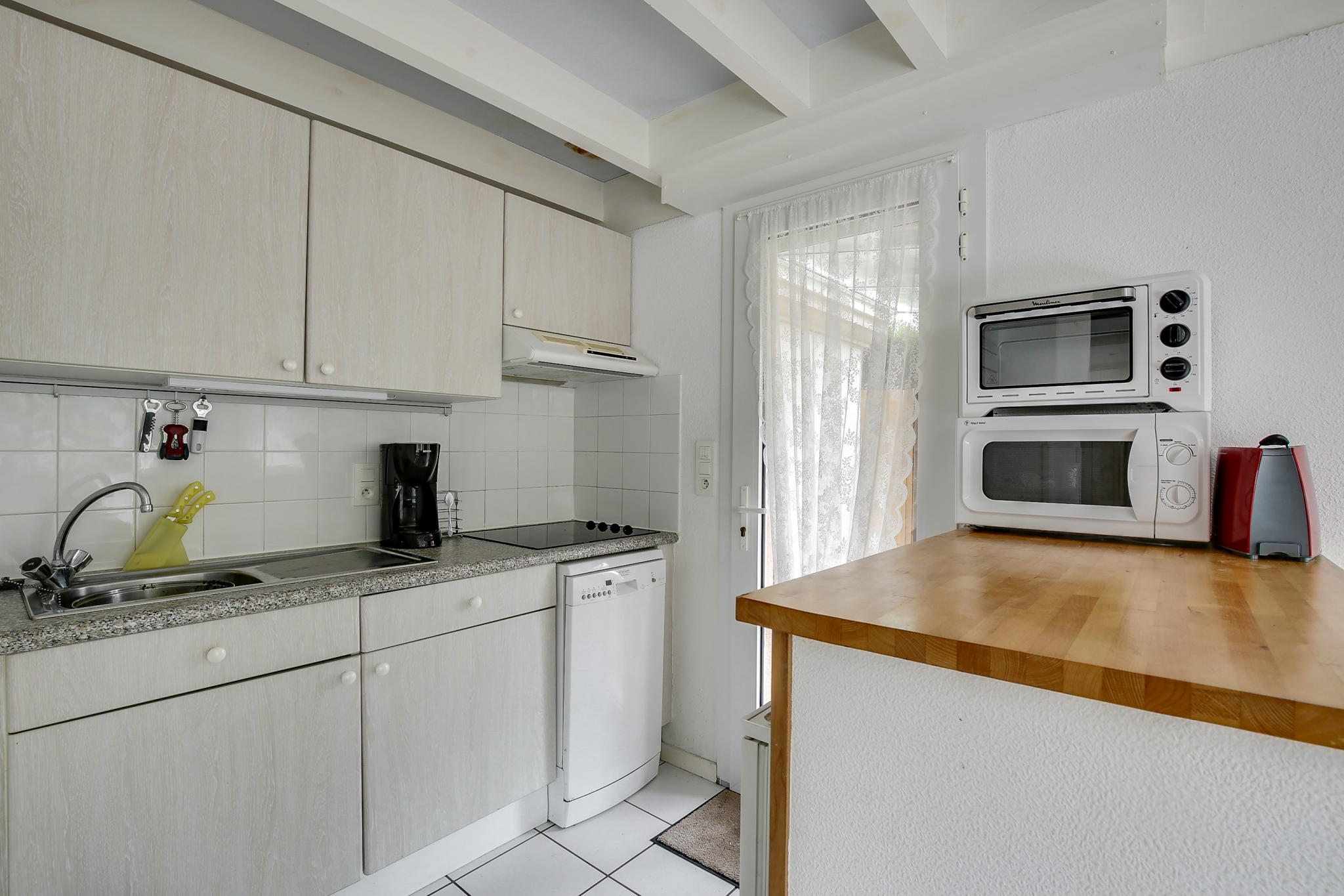 Cuisine ouverte donnant également sur une terrasse couverte exposée EST, équipée de plaques vitrocéramiques, hotte, micro-onde, cafetière, grille-pain, bouilloire, lave-linge et lave-vaisselle. A l’étage, 1 chambre avec un lit double (140) et 1 chambre avec 2 lits doubles superposés(140). Nombreux rangements. Lit Parapluie. Salle de bains. WC indépendant. A l’extérieur, agréable jardin paysagé avec barbecue, et salon de jardin.