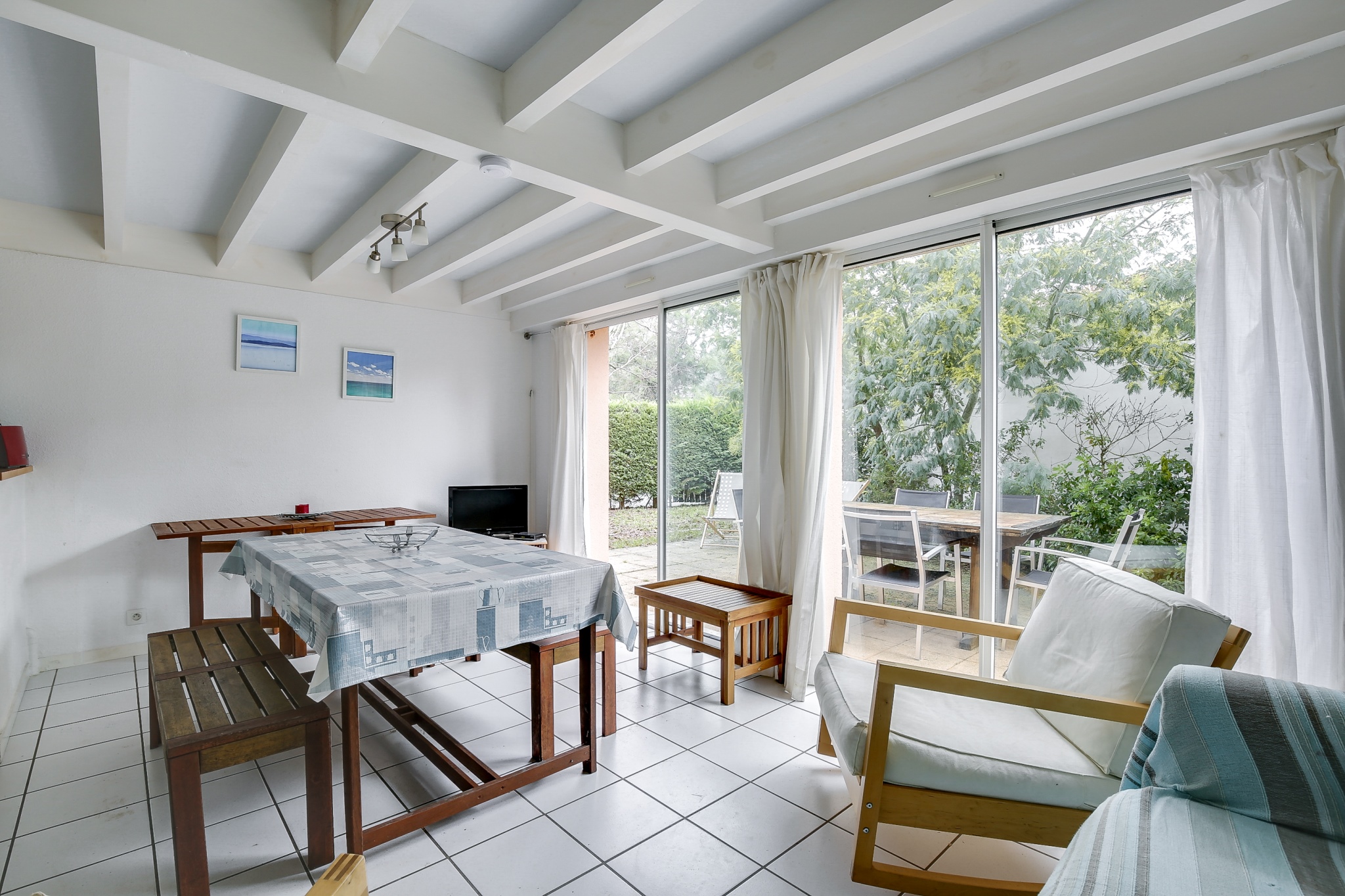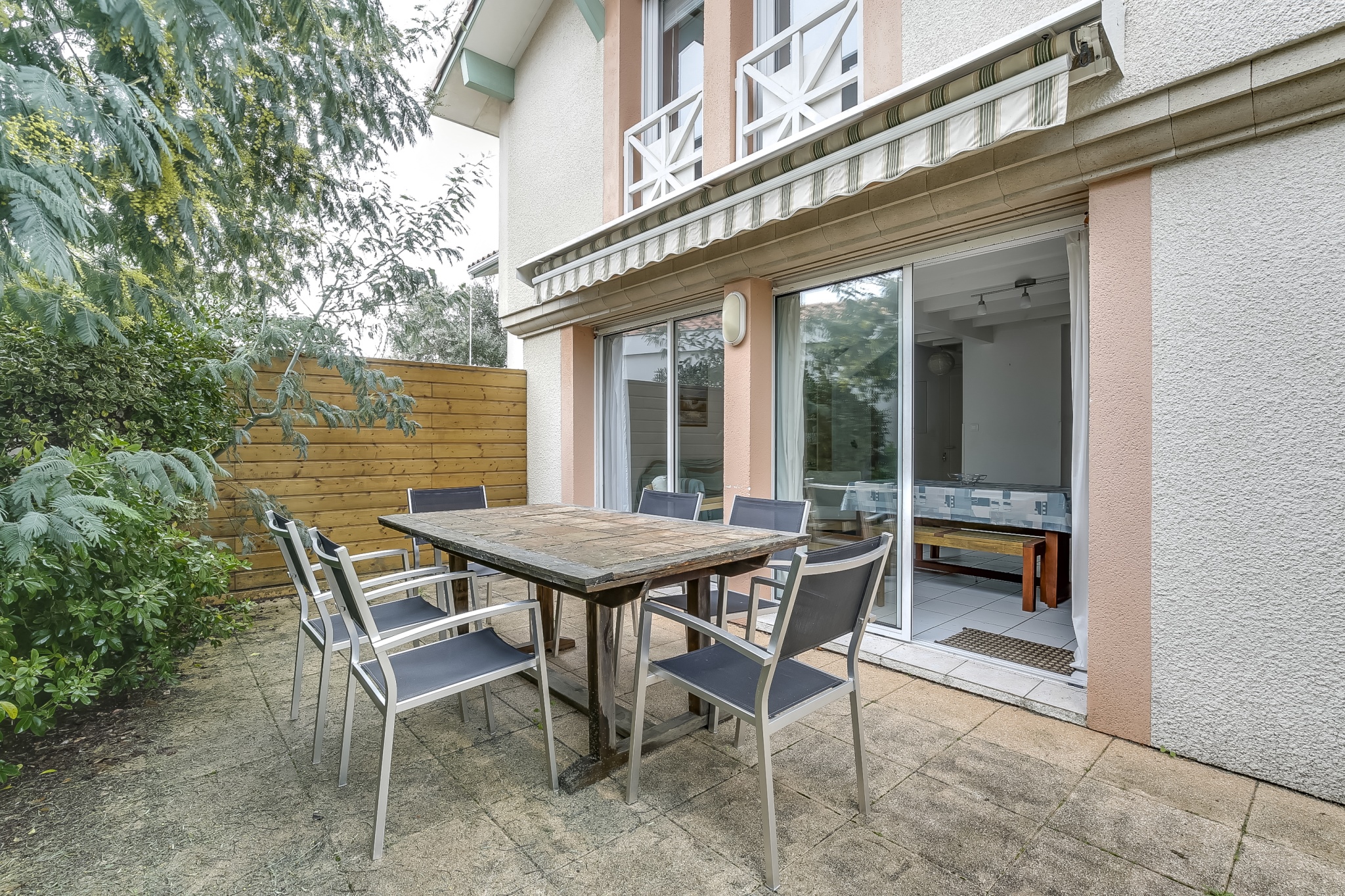A 700 m de plages et 900m du centre de la station. Dans un quartier calme, petite résidence récente composée de 7 maisons jumelées. Maison T3 en duplex avec jardin clos d'environ 110m2. Salon avec TV, et baies vitrées ouvrant sur la terrasse de 25m2 exposée SUD-EST - jardin.
