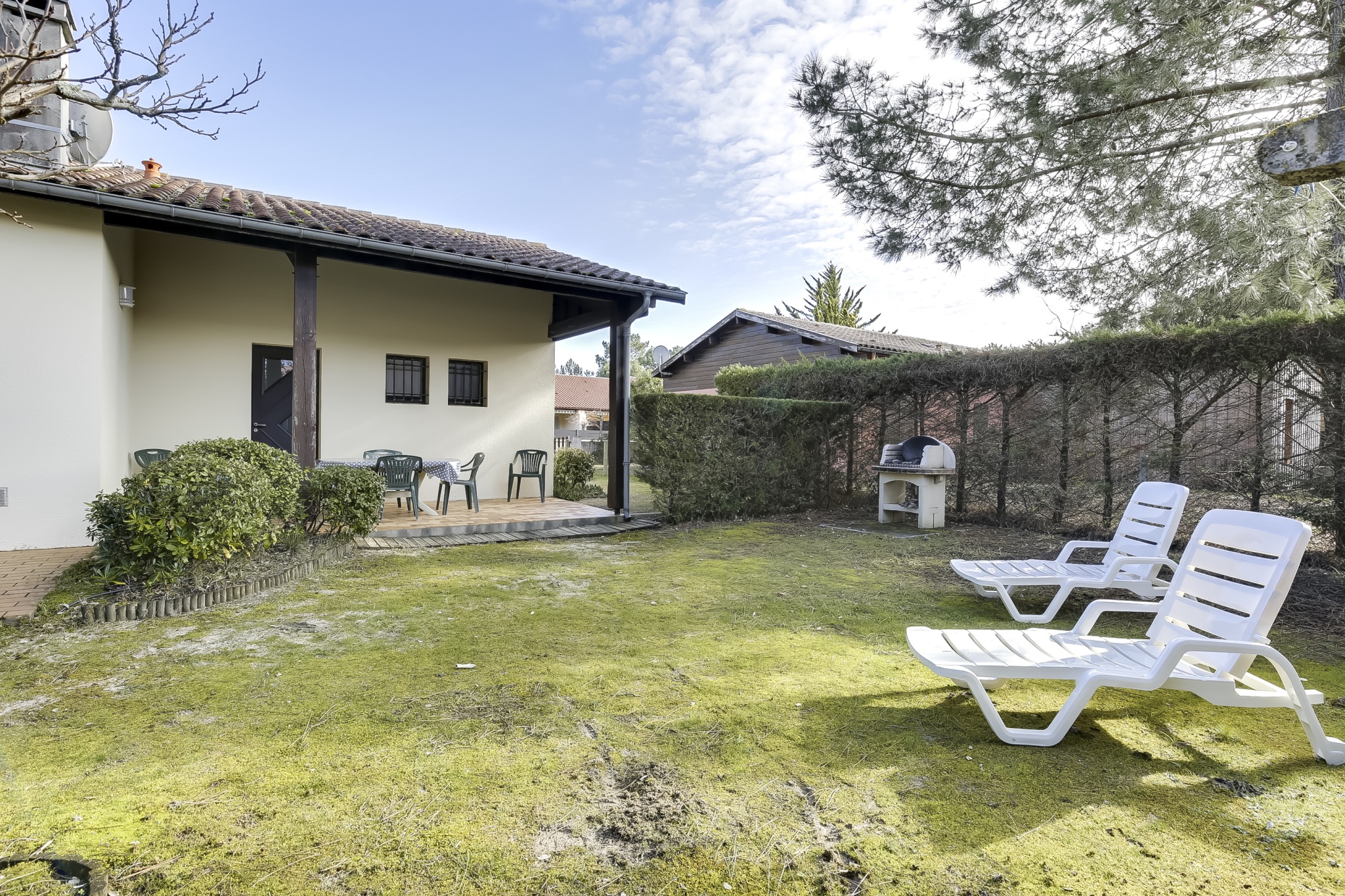 A l'extérieur, barbecue en dur, salon de jardin, bain de soleil.