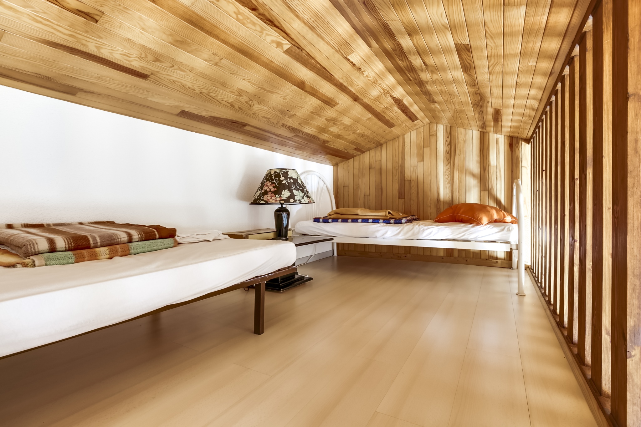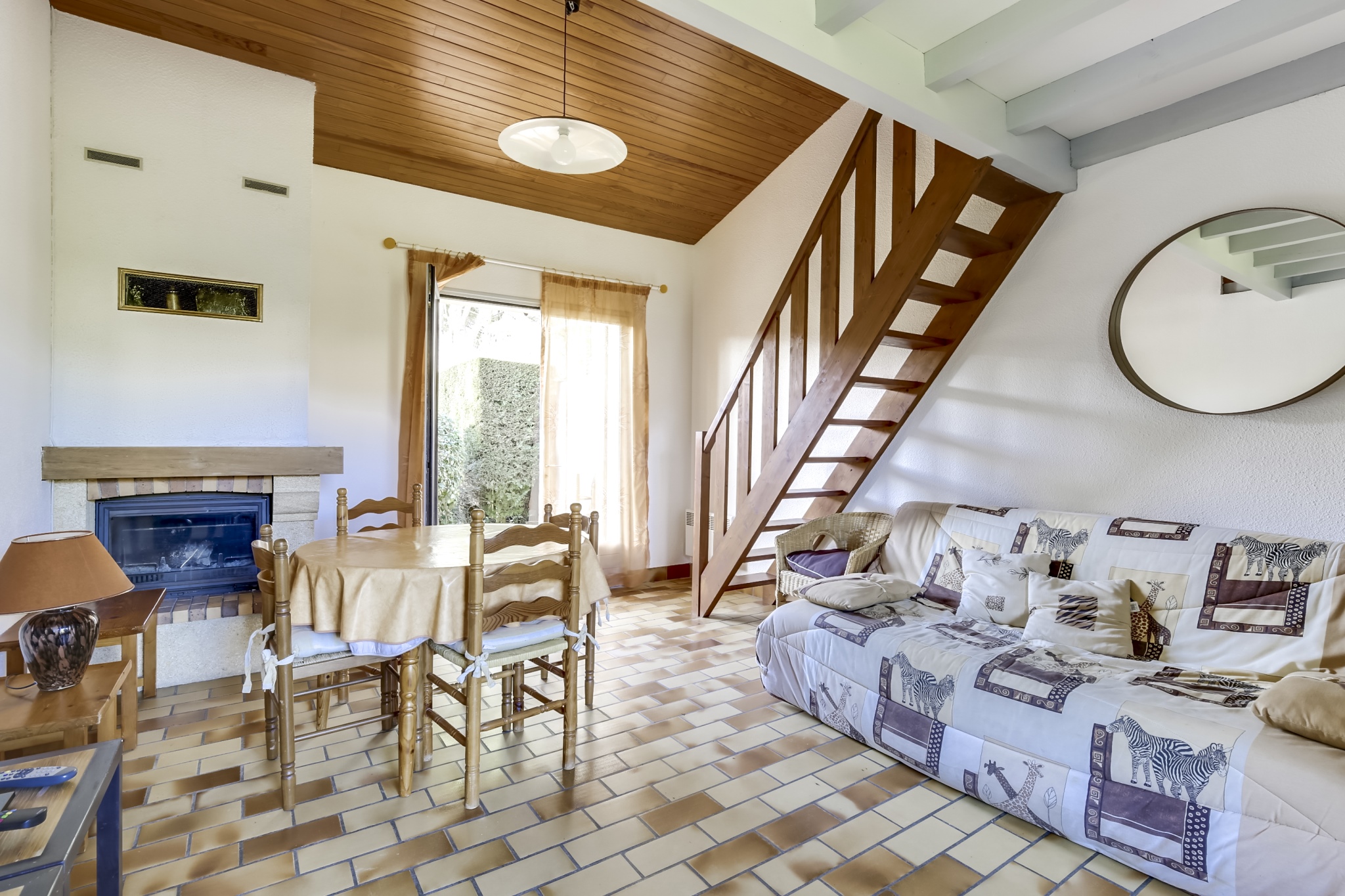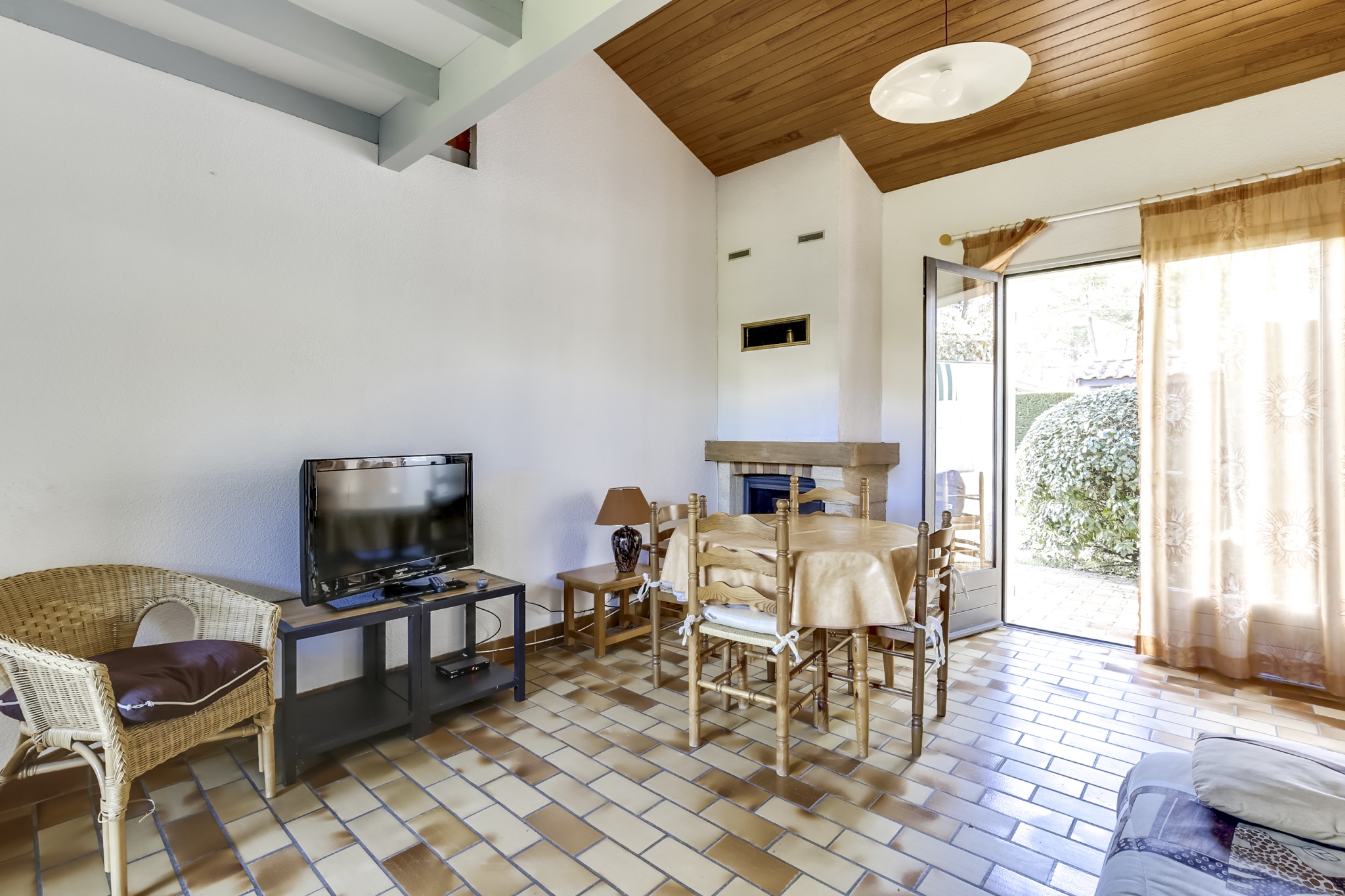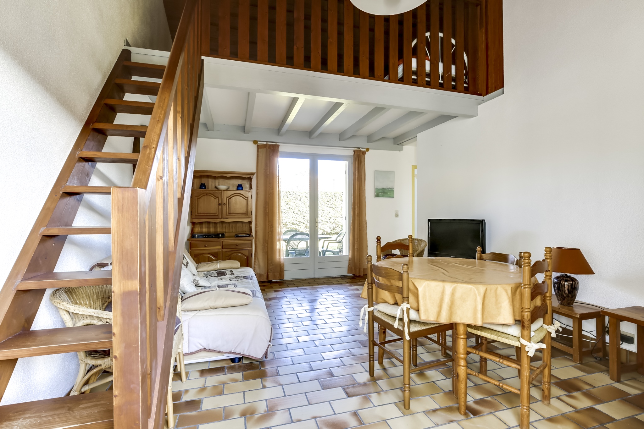 A l'intérieur grand séjour traversant de 20m2, donnant sur deux terrasses, avec téléviseur, cuisine équipée de plaques de cuisson au gaz, micro-onde, mini-four, cafetière et lave-vaisselle, bouilloire, grille-pain. Deux chambres avec un lit double en 140. Une belle salle d'eau comprenant un lave-linge. WC séparé. A l'étage, une mezzanine avec deux lits simples.